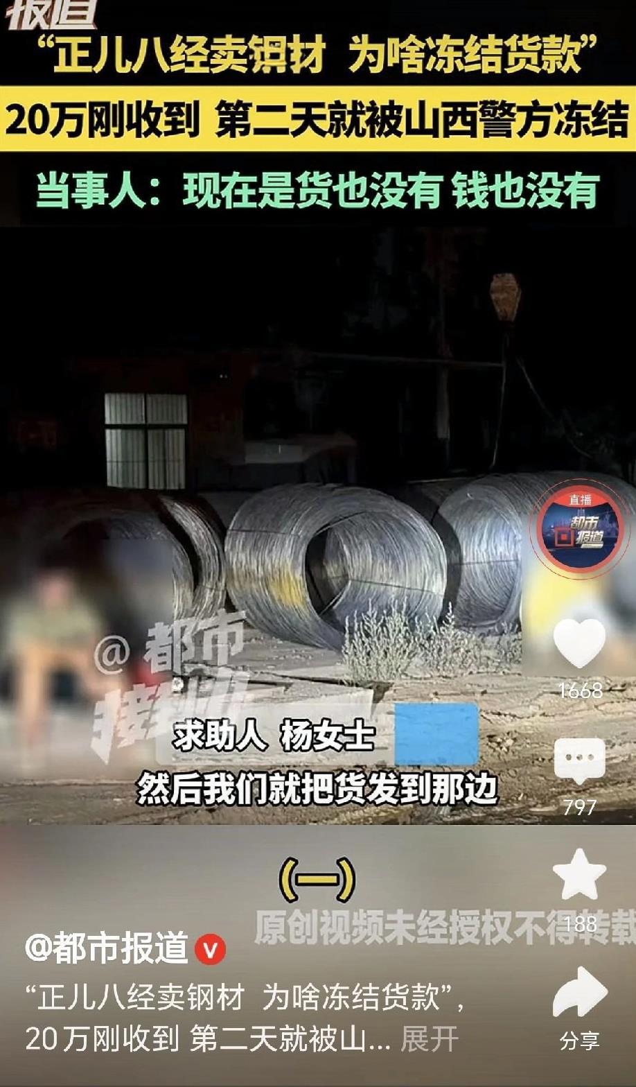 河南郑州,一女子做钢材批发,接到一单大生意,客户要她把66吨盘螺,发到指定的项目上,客户打来20万定金,女子立刻发货,货到签收之后,客户把尾款给她支付,万万没有想到,第2天女子发现,账户被冰结了,女子到银行一问,是这笔资金有了问题,女子找警方询问,我正经做生意卖钢材,怎么就把我的账户冻结了?警方说这是涉诈资金,有可能要退回受害方,女子大哭: 我钱也没了,货也没了,我正常做生意,我怎么能知道这个资金是哪里来的? 杨女士做钢材批发生意,她经验丰富,还在某平台上发布了销售信息。 8月28日,平台上来了位客户,客户联系她说,要买66吨螺纹钢,要她报出价格。 俩人谈好之后,客户给她地址,要她把货发到河南商丘,他们在那里有一个项目。 对方打过来20万定金,杨女士收到定金,确认无误,可她又发现,联系他的这位客户,显示地址是在广东深圳。 杨女士略加疑惑,但客户解释,是他们的工作项目目前在商丘运作。 杨女士没有多想,毕竟做大生意的人,无论在哪里,都能拓展出他们的业务。 随后杨女士立刻安排,把66吨螺纹钢如数发货,没过多久,物流显示,货物平安到达,对方顺利签收,这一单生意非常的顺利,客户很快就把尾款支付。 杨女士收到尾款,又把进货款支付给了市场方,这单生意做的如此顺利,皆大欢喜,杨女士心里美滋滋的。 可她万万没有想到,第二天她做生意转账,突然发现账户被冻结,账户上显示: 只收不付,不允许做交易,如有疑问,请携带有效证件到我行柜台处理。 杨女士以为是误会,立刻拿着身份证赶到银行,银行回复她说,她的账户被山西警方给冻结了,是这批资金有了问题。 杨女士连忙联系那位采购钢材的客户,客户对杨女士进行了安抚,他要杨女士不要着急,他会立刻核实情况。 然而过了两天,杨女士再度联系他询问情况,可电话拨了几遍,显示对方已经无法接通。 对方失联了,杨女士心里害怕,立刻又联系了收货方,可收货方电话,依旧无人接听,钢材已经被他们给转走了。 杨女士惊出一身冷汗,又联系到山西警方,希望知道到底是怎么回事,警方回复她说,山西有个人被诈骗了,这笔货款是涉诈资金,有可能会被原路返回。 杨女士急了,如果原路返回,那她岂不是落了个两手空空?她把货物已经发给了对方,钱再被原路返回,她平白无故的,导致钱货全都没了。 这样一来,她又成了新的受害者,不但货款没了,就连发出的货物也被对方骗走了。 谁知工作人员并不听她多说,反而告诉她说,这笔款项对你来说是货款,对于我们来说就是被骗的钱! 杨女士心里委屈,我是正经做生意的,正常卖货收款,我们普通做生意的人,怎么知道这笔钱是从哪来的? 事情不但如此,杨女士把进货钱支付给市场方,就连市场方的账户也被冻结了。 工作人员只说,现在说啥都没用了,至于杨女士的卡什么时候解冻,给不了答案,得要她们本地人联系他们,看看现在怎么弄。 杨女士没了办法,只好又去找本地警方,警方要她准备好材料证据,等事情查清楚了再说下一步该咋办。 可杨女士难过,受害者的钱返回去,那自己又成了新的受害者,她不能接受,真正的诈骗者却把她的货转走了。 本地警方告诉她说,如果需要配合调查,需要山西警方发函过来。 杨女士感到非常的委屈,她做生意,对这种事情,真的是防不胜防。 警方给她提醒,以后再做大额交易,一定要擦亮眼睛,一定要核实清楚对方的情况,发现有哪里不对,千万不要轻易去做交易。 那么,这件事在法律上是怎么认定的呢? 《刑事诉讼法》规定,司法机关在侦查、起诉、审判刑事案件过程中,有权对与案件有关的财物、账户进行冻结。 山西警方因有人被诈骗,涉案货款被认定为涉诈资金,为防止资金被转移,依法对杨女士的账户进行冻结。 《最高院关于办理电信网络诈骗等刑事案件适用法律若干问题的意见》,他人善意取得诈骗财物的,不予追缴。 虽然涉诈资金需要依法追缴并返还给最初的受害者,但如果杨女士能够证明自己是善意取得这笔货款,即不知道资金是诈骗所得,交易是真实合法的,且支付的对价合理,那么这笔资金不应被追缴。 《民法典》第311条规定,无处分权人将不动产或者动产转让给受让人的,所有权人有权追回;除法律另有规定外,符合下列情形的,受让人取得该不动产或者动产的所有权:(一)受让人受让该不动产或者动产时是善意;(二)以合理的价格转让;(三)转让的不动产或者动产依照法律规定应当登记的已经登记,不需要登记的已经交付给受让人。 杨女士有完整的钢材买卖合同、物流发货记录,且交易价格符合市场行情,如果她能向警方提交这些证据,证明自己在交易过程中是善意的,那么她有可能被认定为善意取得,从而维护自己的合法权益。 对此,你怎么看?欢迎评论区留言讨论。 关注@王哥说法 看百家故事,学法律知识。