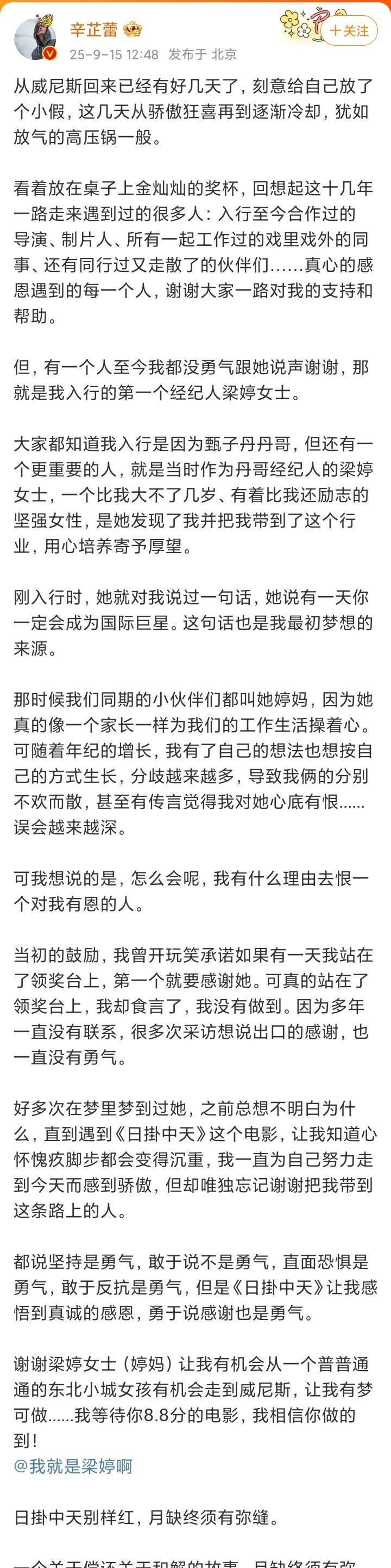 “可以泄露天姬了”,看到甄子丹经纪人发给辛芷蕾的长文,泪奔了,原来娱乐圈也有那么多美好,不是只有于朦胧那种遗憾。 甄子丹经纪人梁婷说,确实是她发掘了辛芷蕾,让辛芷蕾从礼仪小姐成长为国际影后,但那是因为辛芷蕾悟性高,有狠劲。 她说,辛芷蕾从没跑过龙套,从没演过烂片,也很讲义气,在2011年辛芷蕾还没知名度时,陆川的电影《王的盛宴》本来已经选定辛扮演女主虞姬,但是要求辛芷蕾与她解约签到陆川旗下,辛芷蕾拒绝了,说她宁可不红也不能忘本,不会解约。 她说,范美丽在最当红时就愿意出面帮当时名不见经传的辛芷蕾去给影视公司老板说情,在娱乐圈只有范美丽才会帮这种忙,范美丽义薄云天。 她说,虽然2015年辛芷蕾因为合约纠纷起诉了她,但是她深信天地间自有公理昭然,2025年看到辛芷蕾在站在威尼斯领奖台上发言没有提到她,她百感交集。 她说,她培养过的演员,只有尹正拿奖时在台上感谢了她,她说成毅已经很红了,但她还没赚过成毅一分钱,成毅在顶流和超级顶流之间还差了院线电影,希望业内可以找成毅拍电影。 她说她对辛芷蕾的感情是爱恨交织,但广东银干架一定输给东北的,所以她放下释怀了。 她说辛芷蕾解约后曾经喝多了打电话给她,托人转达对她的愧疚,她说她写这篇长文哭了好几轮,她说希望辛芷蕾将来再去欧洲拿奖时要第一个感谢她奖婷,不枉两人曾经相伴一程。 她说她期待她公司出来的三大宝藏,尹正、成毅、辛芷蕾,能够孩子的千年以来的那句老话,证明演员也可以是有情有义、肝胆相照的典范。 最后她请大家一定要对中国电影产业的未来有信心! 梁婷发文后100分钟,辛芷蕾发文回应了梁婷,辛芷蕾说,是梁婷把她带入行并且用心培养寄予厚望,而她因为分歧与梁婷一拍两散,她心怀愧疚,但她永远感激她,谢谢婷妈让她从一个普通的东北女孩到站上威尼斯领奖台。 很多演员不是没有条件大红,而是没有像辛芷蕾一样,遇到一个像梁婷一样优秀又有情怀的经纪人,比如乔任梁,比如于朦胧……