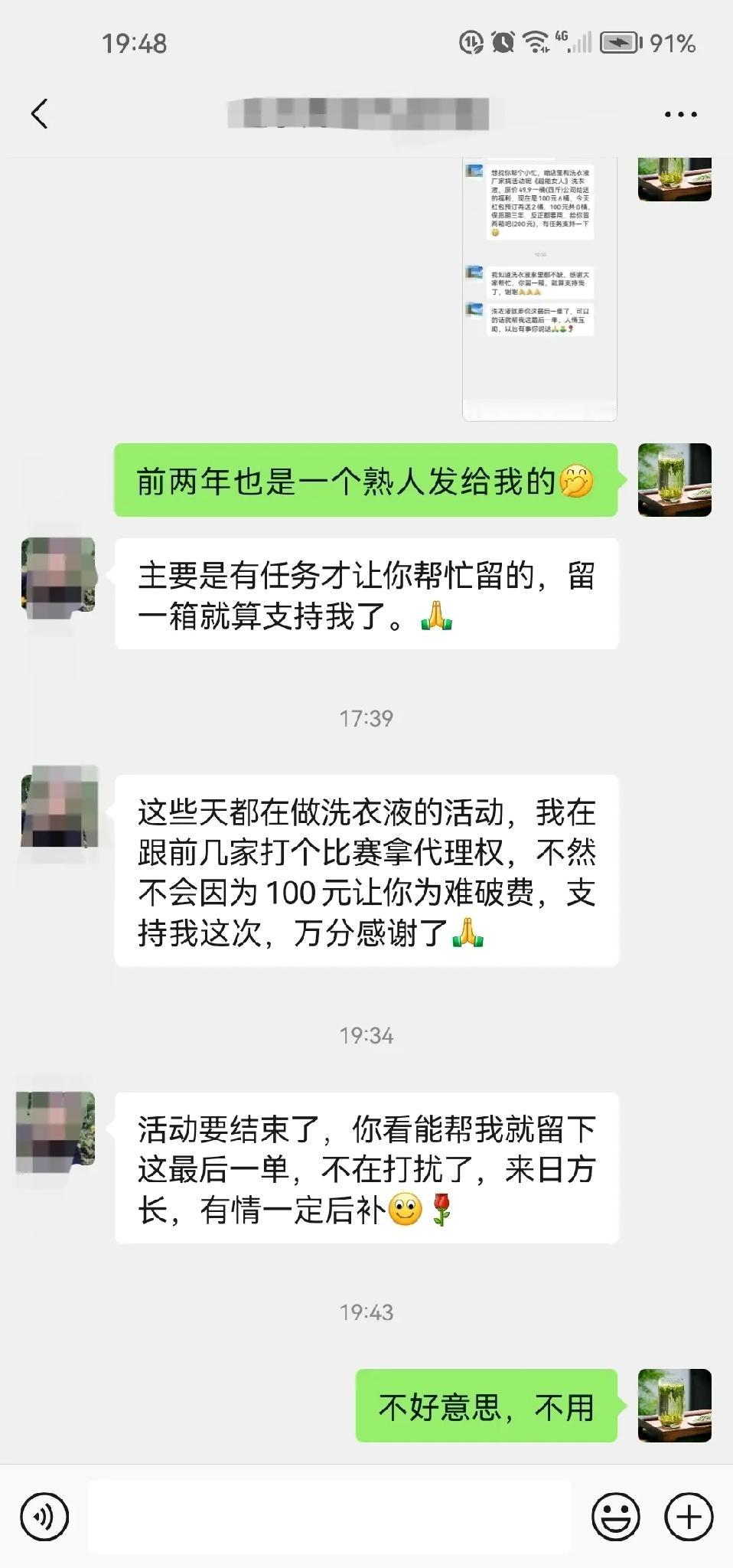 人一不要脸,天下无敌 两个月前拔了次罐, 老板娘加微信时我还以为是方便预约,结果除了付款那天,我俩聊天记录干净得像新号。昨天突然弹来消息,一上来就推销保健品,我怕尴尬,说“暂时不需要”,结果人家跟没看见似的,隔半小时就催一次,一会儿说“错过没优惠”,一会儿说“对身体多好”,最后我实在顶不住,直接说“不用了谢谢”,才总算清净。 真搞不懂,这到底是觉得我好说话,还是觉得加了微信就必须买她东西啊?我跟她既不是朋友,也没求着她办事,难不成还能指望再拔罐不花钱?现在的人啊,总把“自来熟”当本事,把别人的委婉当默许,一点边界感都没有,殊不知这样只会让人想立马拉黑。 你们遇到过这种加了微信就硬推销的吗?最后都是怎么解决的,来评论区聊聊呗!