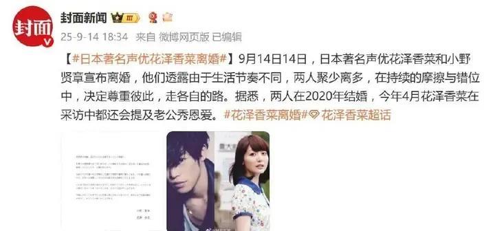 花泽香菜小野贤章,九月十四号一大早,那个声明一出来,粉丝圈子直接就炸了,俩人说要分开,理由也说得挺清楚,平时见不着面,生活节奏差太多,这婚结了五年多也就这么停了,好多人一下都没缓过来。 那份声明出来,大家心里就有数了,这事儿不突然,花泽香菜的音乐活动搞得越来越大,全世界跑着巡演,不怎么在日本待着,小野贤章那边呢,舞台剧、配音、拍戏,行程排得满满当当,俩人根本碰不着面,社交账号还是同一时间发的,还挺有默契。 当初结婚,二零二零年七月八号,网上全是神仙眷侣的说法,金童玉女,整个声优圈都在祝福,现在五年过去,还是没能一起走下去,花泽香菜,东京人,八九年的,那首恋爱循环一出来就火遍了,表情包更是成了三大巨头,小野贤章,福冈人,也是八九年,代表作一大堆,《黑子的篮球》、《终结的炽天使》、《文豪野犬》,这些名字一说,粉丝都熟。 他们俩,本来就是工作上认识的,一七年被拍到住一块儿,后来事务所也干脆承认了,挺大方的,没藏着掖着,结婚那天,粉丝都说自己看哭了,现在离婚又哭了,评论区好多人留言,“还是要祝福你们”,也有的说太可惜了。 工作节奏这事,声优这行,真没辙,强度特别大,行程对不上,花泽香菜这几年重心往华语圈偏,到处飞,国内舞台也上得多,小野贤章基本就在日本,演舞台剧、配音,加班是常态,三个月都见不上一面,这种日子什么感觉,外人体会不到,二零二五年四月,花泽香菜接受采访还夸老公,分享日常,外面看着挺甜,私底下可能早就不是那么回事了。 两个人分开,声明里特地写了,没别人,还是朋友,工作上也会互相尊重,事务所也表态,以后不再回应离婚的事,社交账号上跟对方有关的东西都删了,网友都说这处理方式挺体面的,没闹腾,以后就各过各的。 圈内人看得也明白,声优这工作,平均一天录音十二个小时,档期根本没法凑,经常不在一个地方,好多人说谈个恋爱都跟异地加跨国似的,别说结婚了,能坚持几年下来都算厉害,粉丝留言,有感慨也有理解。 事业不会停的,声明里说得很清楚,分开不影响专业,花泽香菜的《恋爱循环》是宅圈神曲,小野贤章配的《黑子的篮球》、《JOJO的黄金之风》,都还在忙新项目,各自都有精彩,粉丝们也等着他们复出,关注新作品。 一起上《我的英雄学院》那会儿,粉丝都喊次元壁破了,现在虽然各走各的路,但也没人说不好,八年感情,从公开到结婚再到分开,没吵没闹,就这么结束了,成年人的分手,可能就这样吧,未来的路还长,谁也说不准以后会怎么样,但眼下,算是画上了一个句号。