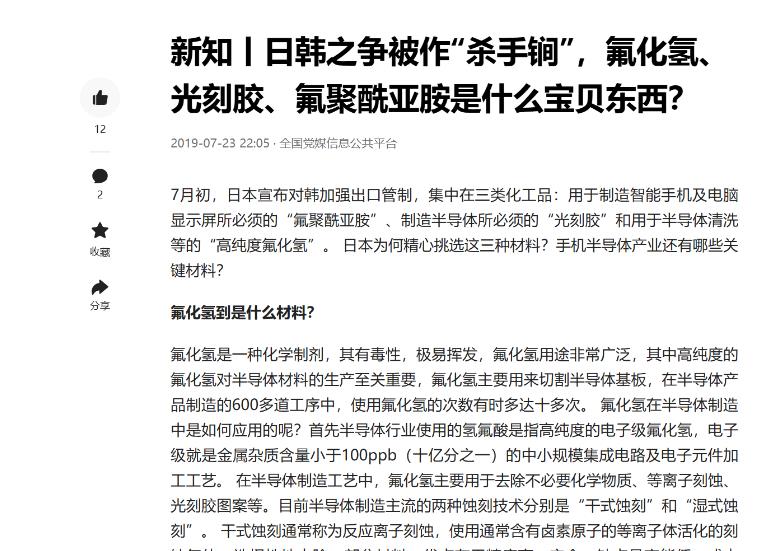 那会儿日本经济产业省一纸公告,直接把 19 种半导体制造核心材料纳入出口管制清单,除了人尽皆知的光刻胶和氟化氢,还有像电子级氨水、光刻胶剥离液这类平时不显眼但缺了就玩不转的东西。