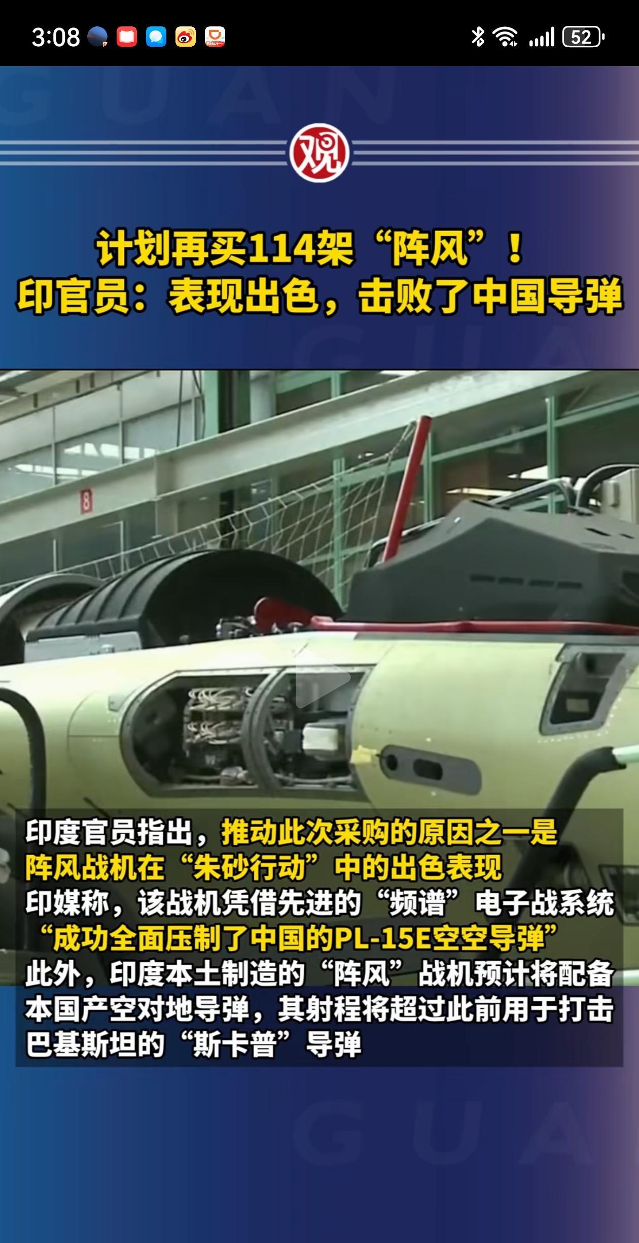《今日印度》近日报道,印度国防部已收到印度空军新增114架在印度生产的法国“阵风”战斗机提案。印度官员指出,推动此次采购的重要原因是在“朱砂”行动中的出色表现,它成功击败了中国产PL-15E空空导弹。 今年7月3日,印度国防部前首席顾问维诺德.汉达雷接受CNN采访时表示,印巴空战印度之所以取得决定性胜利,因为中国的J-10CE战机、PL-15E空空导弹没有经过实战检验,而且出口到巴基斯坦的导弹,加注的水而不是燃然,我们没有必要担心。