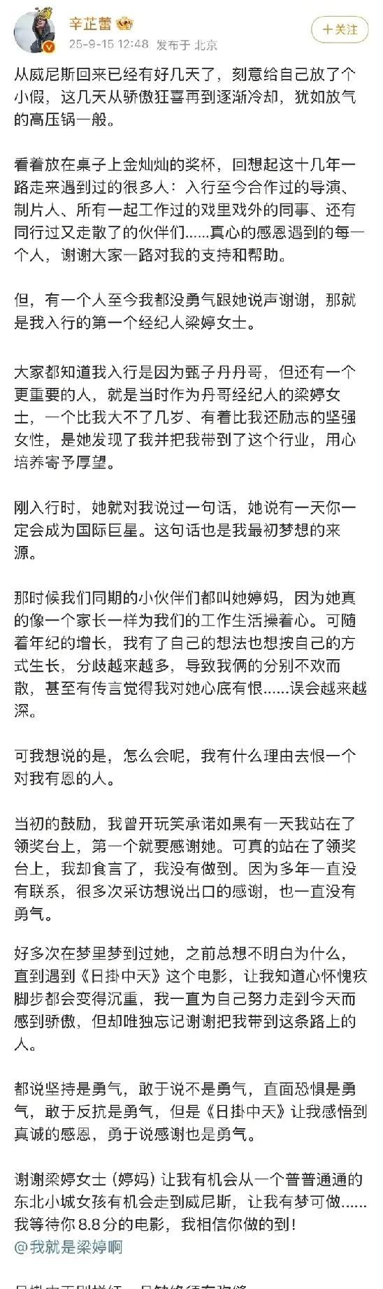 辛芷蕾发了个长文,专门提了梁婷,说这是带她入行的第一个经纪人,好多年前就该说的那句谢谢,拖到现在才讲,话里话外没什么客套的,都是心里话,说当年怎么一起干,后来又怎么分开,人年纪大了想法就多,脾气也变了,俩人走着走着就不是一条路了,分开那天闹得也不好看,外面传什么的都有,说她们有疙瘩,心里有恨,传得有鼻子有眼。 辛芷蕾自己说,哪有道理去恨一个帮过自己的人,想想看,那些年都是一起闯过来的,梁婷领她进门,教她东西,帮她扛事,还许过一个愿,说以后要是能站上领奖台,第一个名字就喊她,结果真到了那天,人拿奖了,俩人却早就不联系了,心里也没那个底气,记者采访想提一嘴,话到嘴边又咽回去了,好多事就是这样,想说的时候没机会,一晃就过去了。 这圈子里演员跟经纪人散伙,大家看得多了,各种猜,各种传,各种分析,都成了固定节目,辛芷蕾这次不一样,她没藏着掖着说当年不愉快,也没回避自己的那些遗憾,连自己身上的毛病都说了,这挺需要勇气的,也挺实在,大家看惯了那种标准答案式的公关文,都知道是套路,她这篇长文,看着就有人味儿。 谁这辈子没遇到过那么一两个人呢,在你需要的时候拉你一把,陪你走一程,辛芷蕾心里头一直记着这份情,就是没找到合适的口说出来,其实好多人都有这种经历,想说声谢谢,想道个歉,结果一拖再拖就错过了,辛芷蕾这次能把话说开,过去的事就算翻篇了,人总得往前看。 这声谢谢说出口,以前的那些误会也就散了,以后大家都有新的路要走,在这个地方,外面人怎么说不重要,自己心里清楚就行,真心这东西,才能让你走得更远一点。