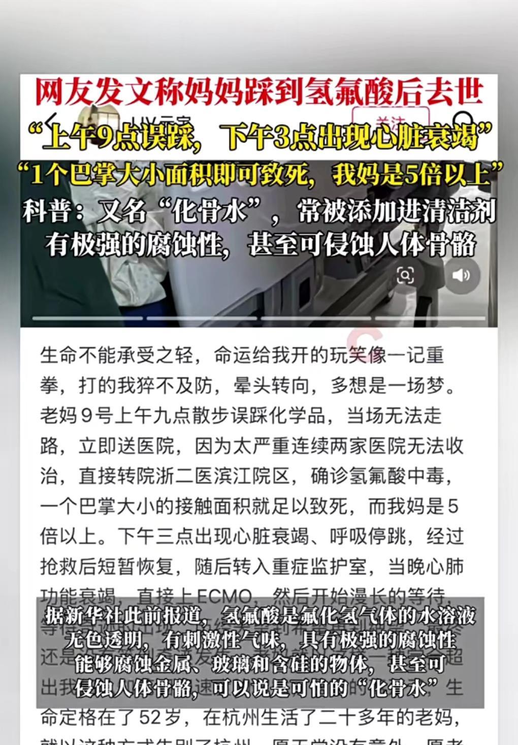 这真的是太可怕了。 想不到世上真的有“化骨水”的存在。 9月14日,网友称其妈妈散步时踩到了氢氟酸,结果几个小时后就去世了。 想不到毒性竟然如此之强。 真的是可怕至极。 强到可以侵入骨骼。 这名女子真是太不幸了,才52岁的年纪。 为什么会有这样的东西在地上?应该查查到底是个什么情况。
