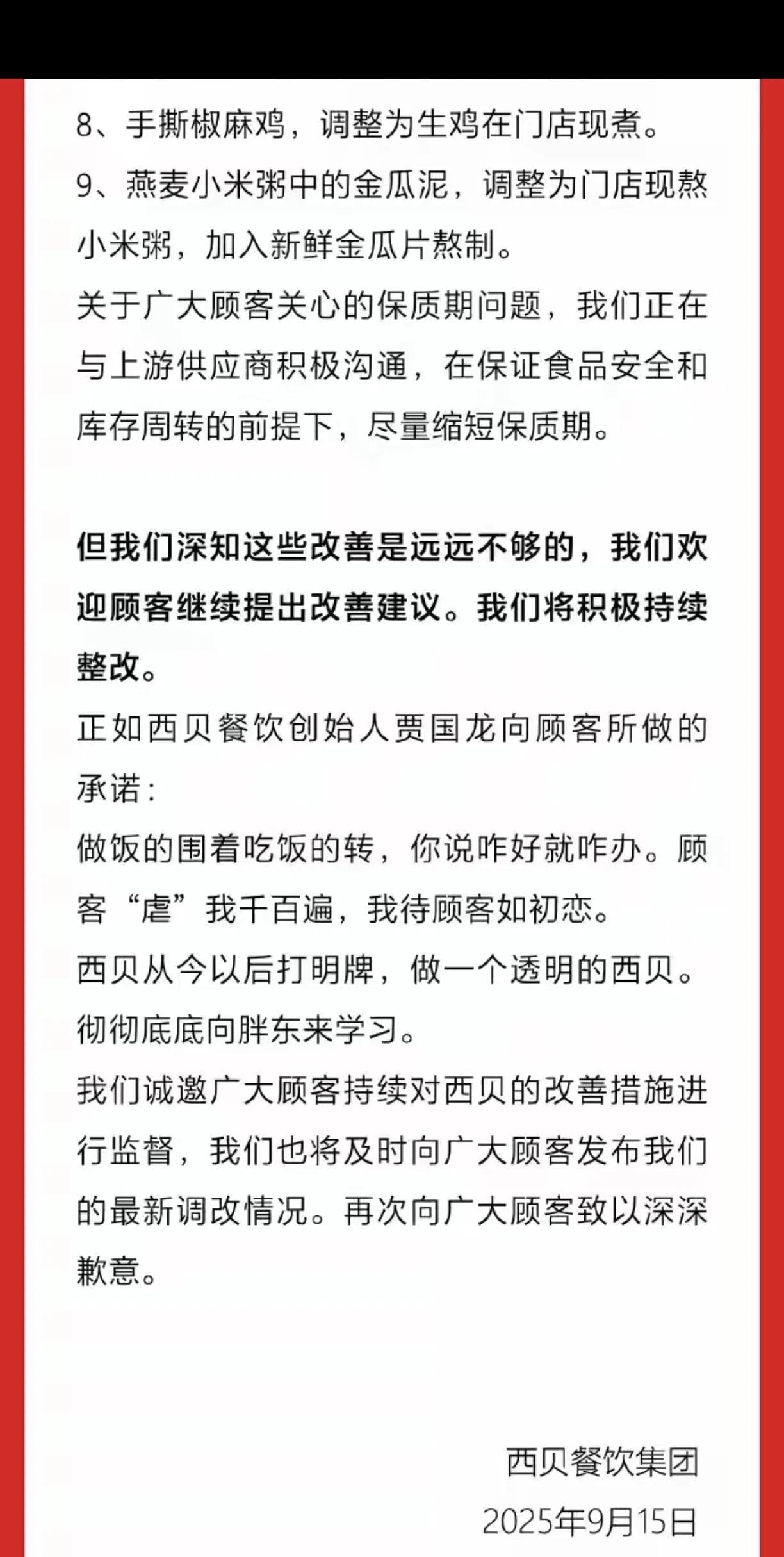 西贝致歉信来了