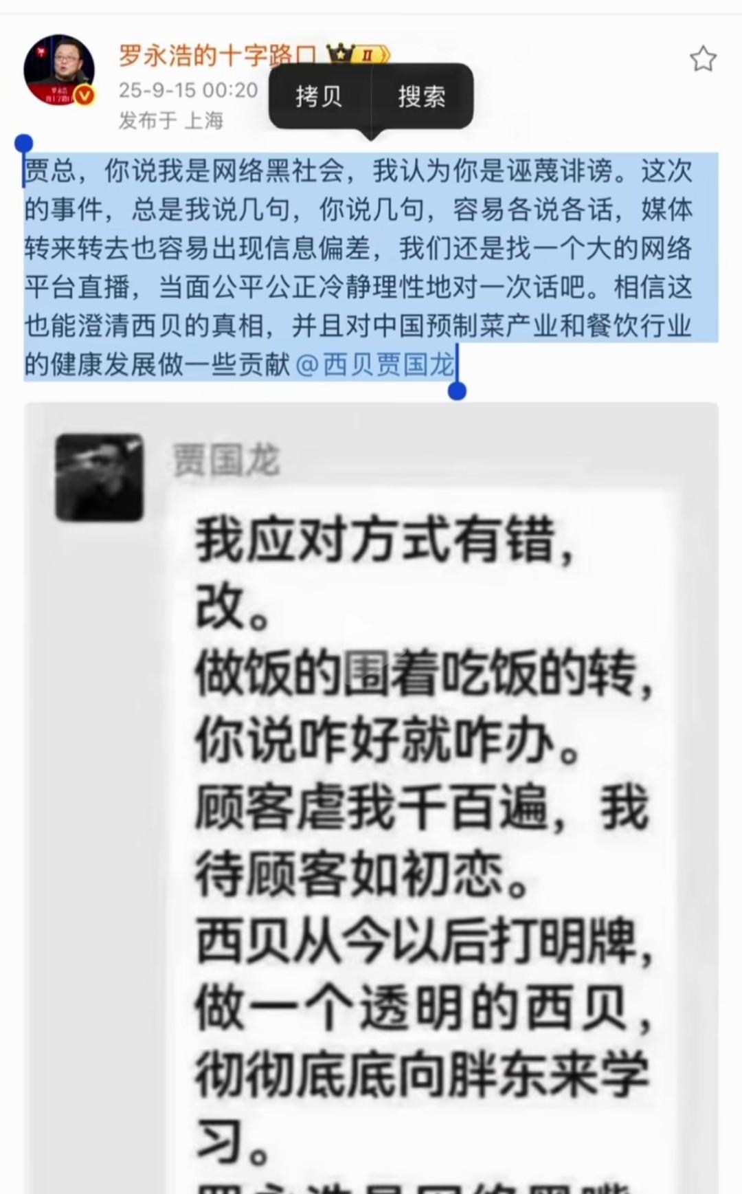 罗永浩彻底怒了,我就骂了你一次,剩下的全是你自杀,你自己邀请媒体去,结果全是问题,还说我是网络黑社会。 罗永浩一句吐槽换来的是西贝自杀式反击,真不怪罗永浩,只怪贾老板前半生太顺了,以至于太狂妄了,太看重面子,听不得一句批评,一句实话。 他把提意见的人当成敌人,不从自己身上找问题,说话和做事不给自己留余地,他说西贝100%不是预制菜,但开放后厨却100%是预制菜。越在乎面子,偏偏丢了面子。 罗永浩说,西贝老板脑子绝对有问题,他们5个人吃了15个菜,菜量少,难吃,吃得一肚子不痛快,但他不为难厨师和服务员,临走时,服务员问他们吃得满意不?他说“挺好”,被西贝老板拿来当证据说他们吃得好,好笑! 贾老板的一条朋友圈不仅将罗永浩彻底激怒,还得罪了顾客。 罗永浩喊话当面公平公正冷静理性的对一次话。 贾老板肯定不敢接招,他说的话,爆的雷都不占理,不是自找其辱吗? 贾老板发朋友圈说,“做饭的围着吃饭的转,你说咋好就咋办。”这不是应该的吗?似乎还埋怨上了,顾客应该配做饭的。 “顾客虐我千百遍,我待顾客如初恋”,合着顾客都不讲理,他西贝是深明大义的?从这两句话中也感觉得出,顾客就是他的冤大头。 西贝的贾老板这次是彻底输了,不是输在罗永浩手中,是输在自己的个性上。 华与华点了一把火后,担心自己受牵连,已经向罗永浩道歉了。贾老板将自己捶懵了,这下该清醒了,门面是顾客撑的,能毁掉也是顾客,真正的朋友是劝你熄火,而不是火上浇油。