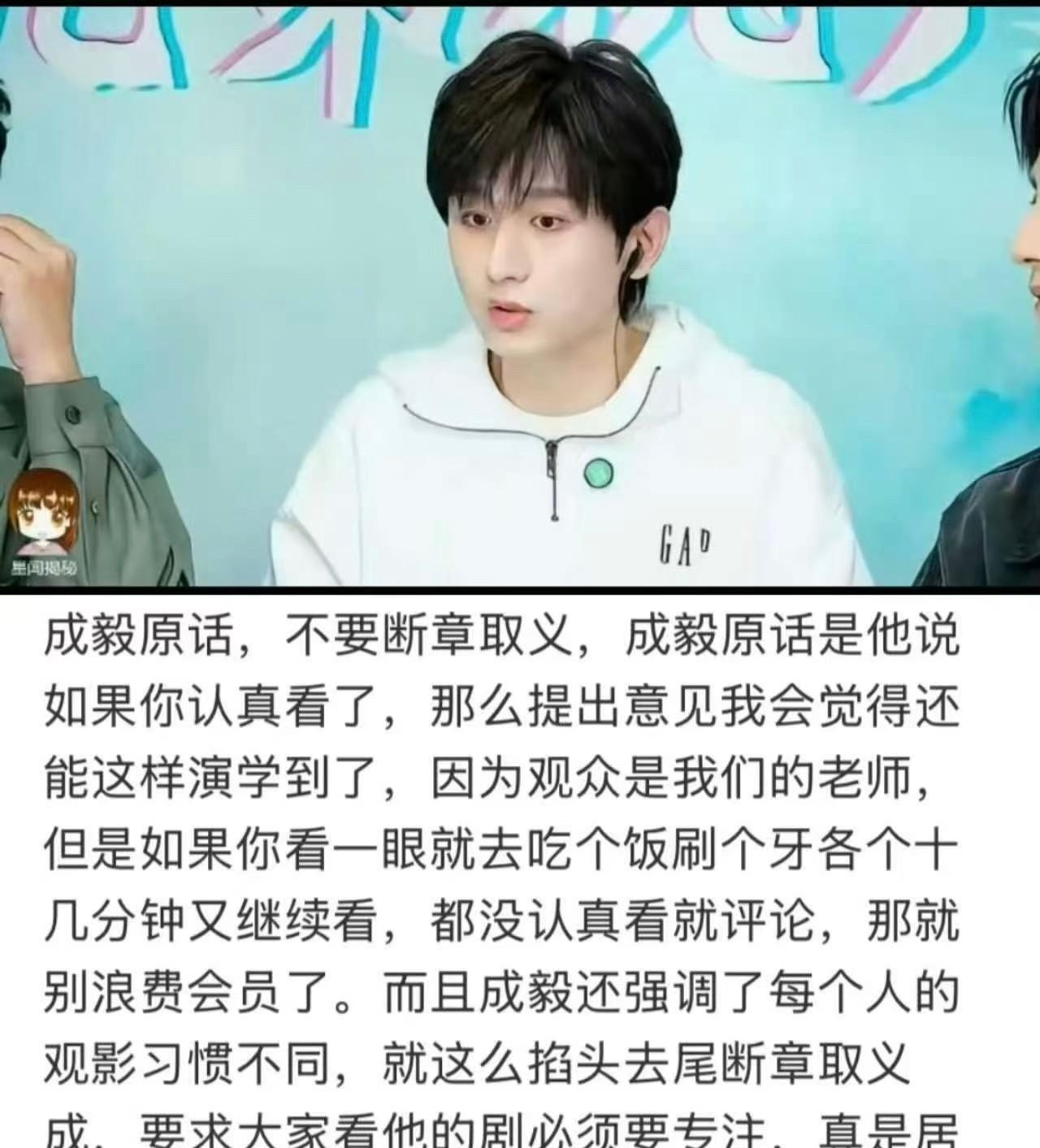 一觉醒来 成毅你给我干蒙了 直播教育观众,说不看就别看了浪费会员,我是万万不相信的,去看了一下昨晚上的直播,原来是被断章取义了。 成毅表达的是观众是他的老师,认真观看后提出的意见他能够学习,但是根本没有认真看,就看弹幕和评论就说不好的就不要浪费会员了。 成毅真的苦,上一部戏莲花楼上映被防爆,《赴山海》也是轻舟已过万重山。