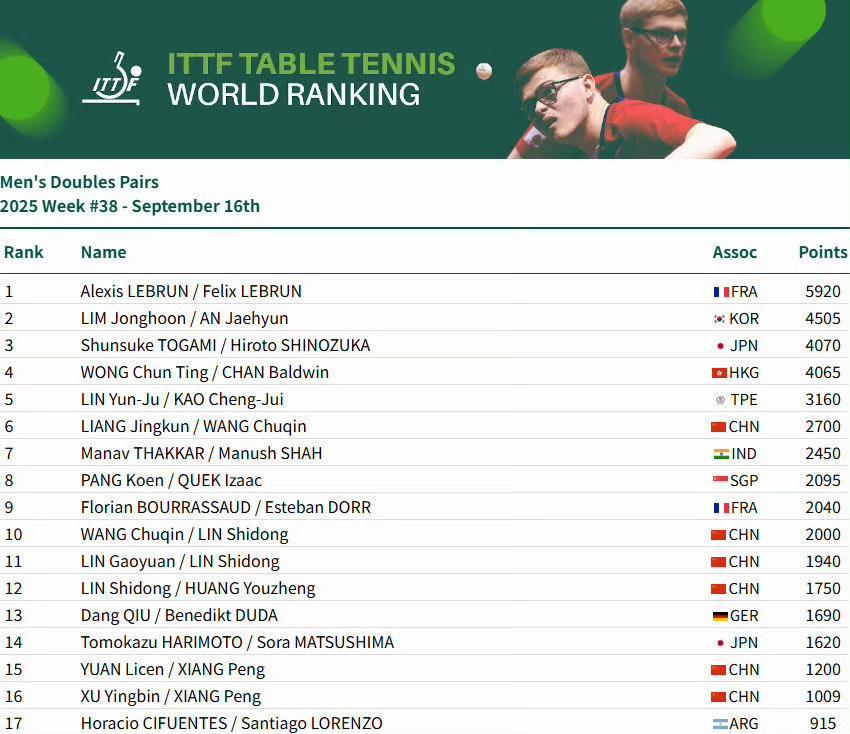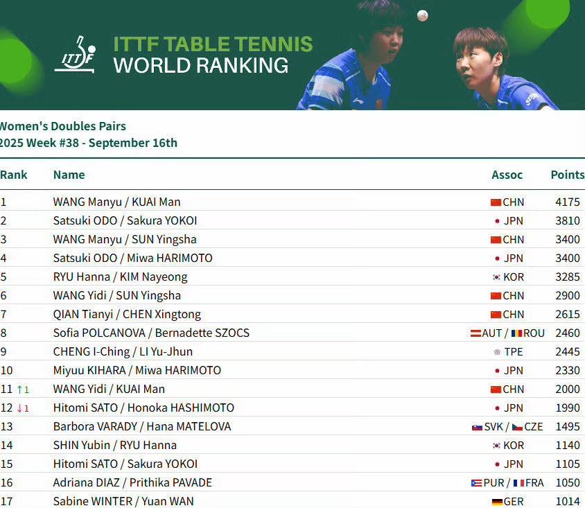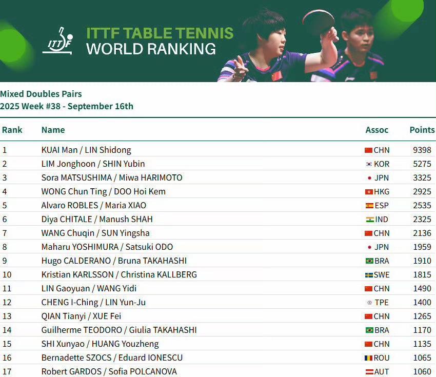 #王楚钦9425分领跑男单世排# 男单:王楚钦9425分、林诗栋位列前二,梁靖崑位列第6,向鹏位列第9 女单:孙颖莎12200分、王曼昱、陈幸同、蒯曼、王艺迪位列前五,陈熠第9 男双:王楚钦/梁靖崑第6、王楚钦/林诗栋第10 女双:王曼昱/蒯曼第一、孙颖莎/王曼昱第三、孙颖莎/王艺迪第6、陈幸同/钱天一第7 混双:林诗栋/蒯曼第1、王楚钦/孙颖莎第7 #2025国际乒联第38周排名#