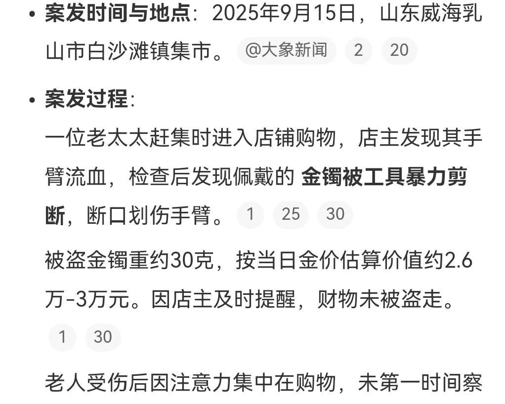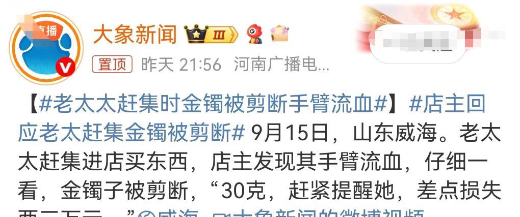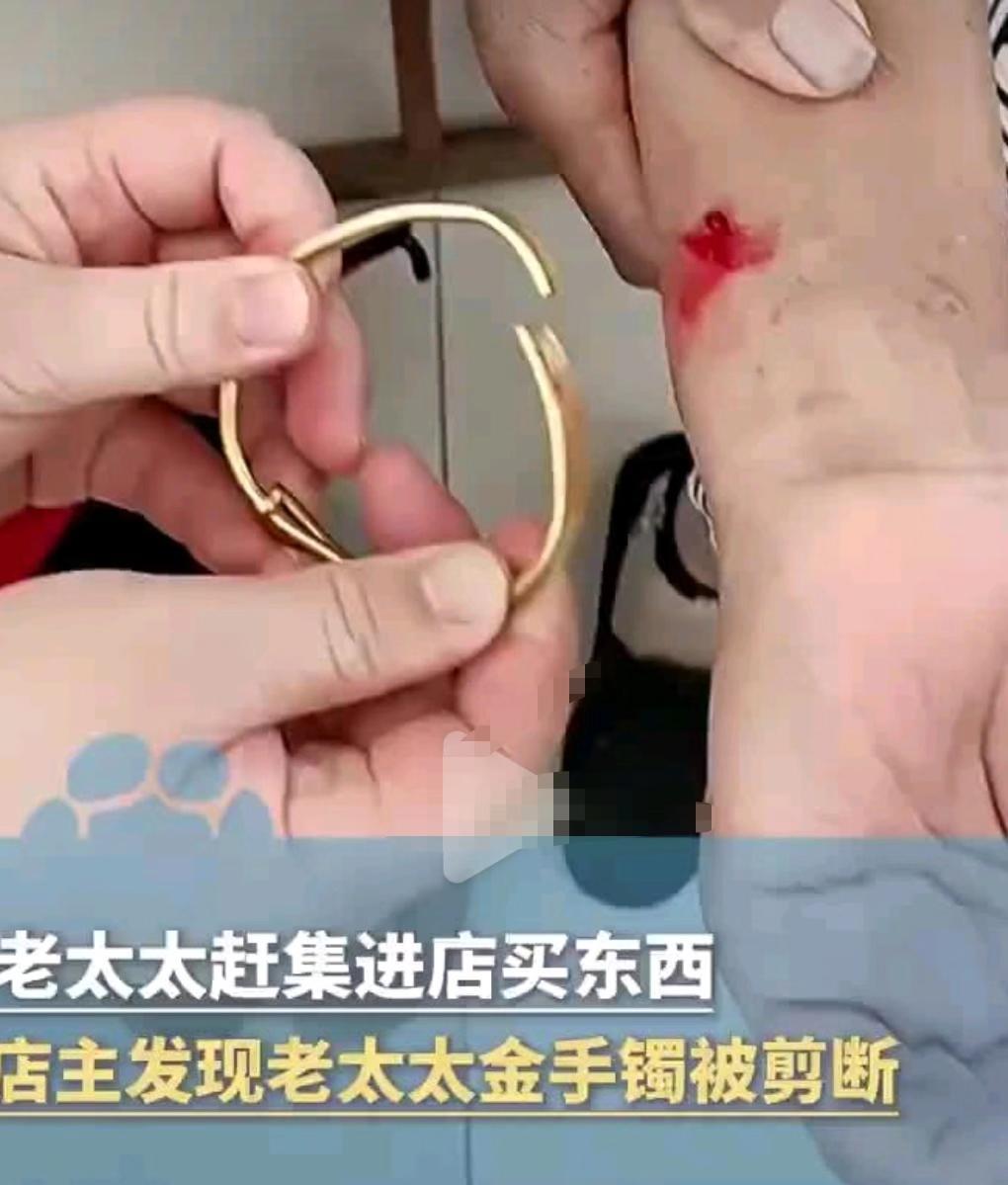 现在的小偷太猖狂。 出门在外还是要学会财不外露。 9月15日山东威海。 老太太赶集时金镯被剪断手臂流血,老太太流血了都还不知道,还是一个店家告诉她流血了。 金镯子已经被剪开了,幸运的是没被小偷给偷走,毕竟两三万块钱。 老太太竟然没有一点感觉。#老太太赶集时金镯被剪断手臂流血