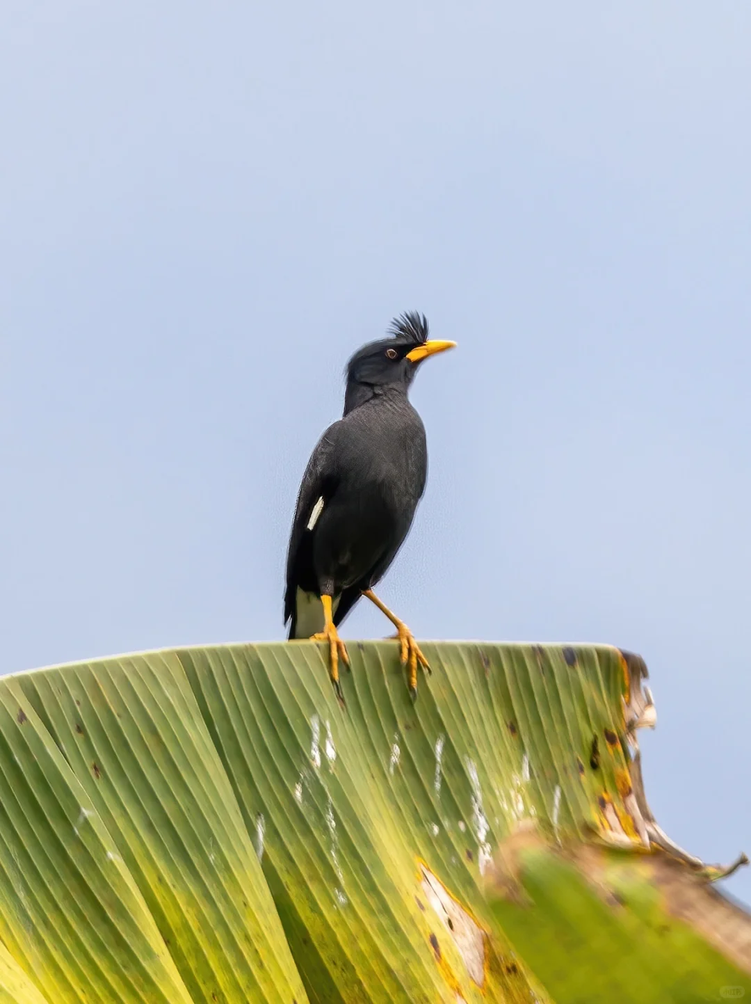 原创拍摄 林八哥,雀形目椋鸟科八哥属。大型八哥,与我们南方常见的八哥的区别在尾端白色更宽,黄嘴巴,臀白屁股。国内罕见于云南、广西。这只在蕉叶说来回翻飞的林八哥还挺有趣的。
