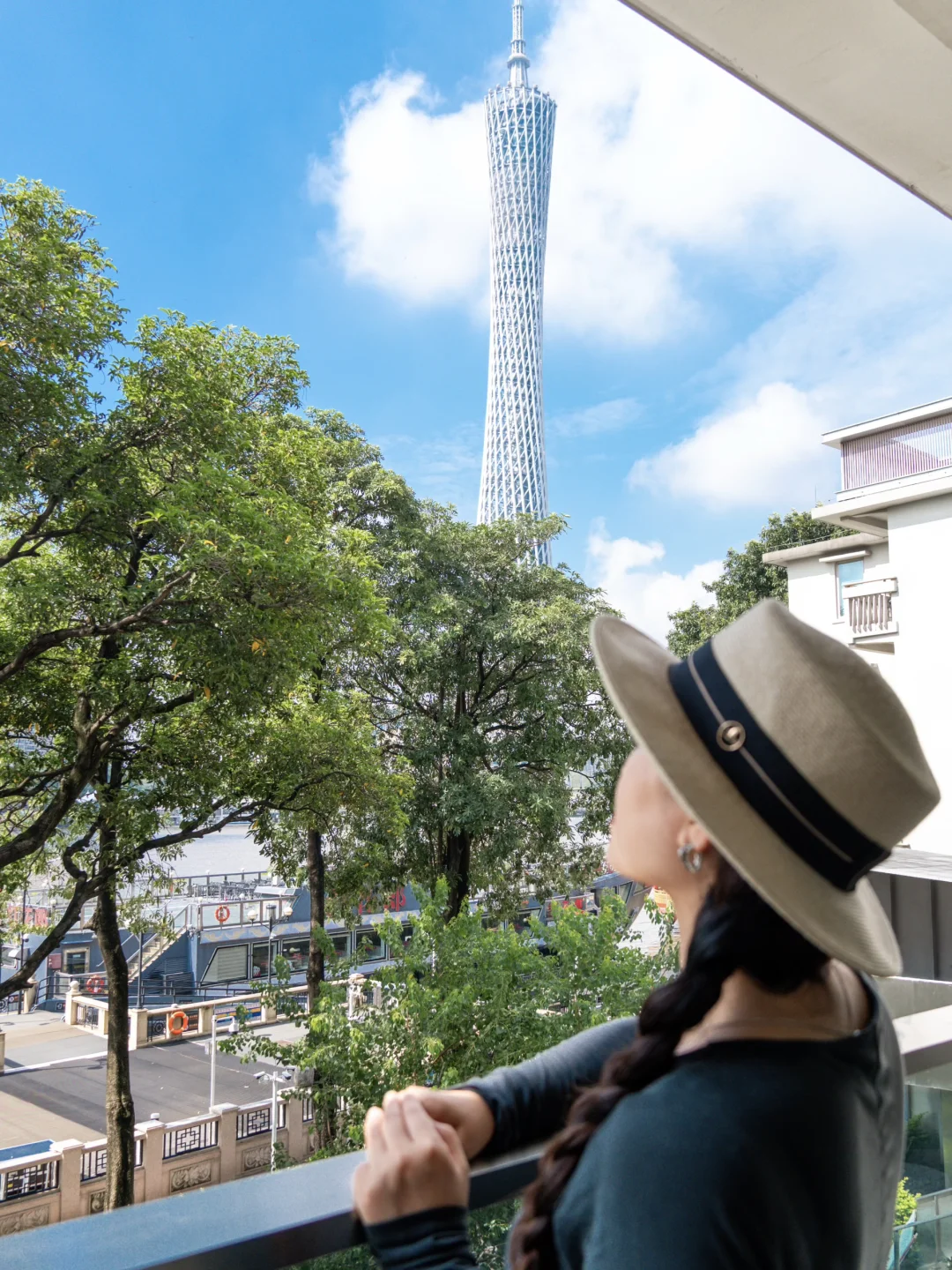 公共区域成排拱门的设计跟古老榕树相映生辉,而房间里的满洲窗,圆形桌,醒狮抱枕,则是把岭南融入到每一个细节里,推开阳台门还能将广州塔美景尽收眼底🥳