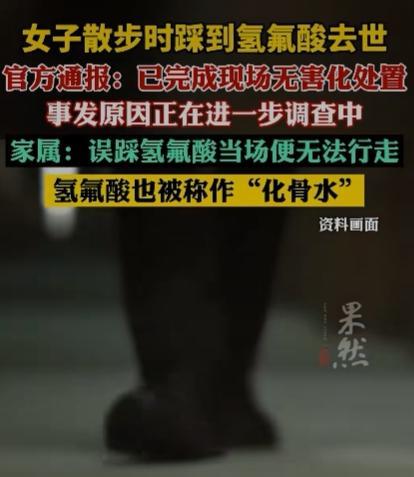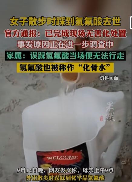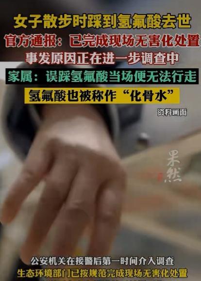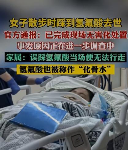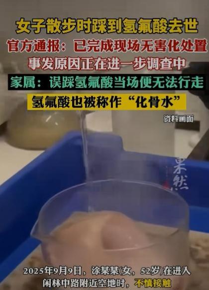 杭州一女子散步时踩到氢氟酸去世,官方通报,现场已完成无害化处置,事发原因在进一步调查之中。家属回应:误踩氢氟酸当场便无法行走,氢氟酸也被称为“”化骨水。”足见其毁坏能力之强大。 来源:齐鲁壹点 女子涂某,现年52岁,近日在进入闲林中路附近的空地时,不慎误踩氢氟酸中毒,送医救治抢救无效于9月14日凌晨不幸身亡。 无论在哪个单位,氢氟酸都是剧毒管制物品,这应该属于危害公共安全罪来论处才行。 有网友说:原来小说里的化骨水,真的存在! 氢氟酸具有强腐蚀性和毒性,接触后应立即采取以下急救措施并尽快就医。 迅速将接触部位放在流动的清水中持续冲洗至少15 - 30分钟,以尽可能稀释和去除皮肤上的氢氟酸。 如果衣物不小心被氢氟酸污染,应尽快小心地脱下,避免进一步接触皮肤。 在冲洗后,可使用葡萄糖酸钙凝胶或乳液涂抹在接触部位。如果没有凝胶,也可以用含有钙剂的溶液浸泡。 这是因为钙可以与氟离子结合,减少氟离子对组织的进一步损害。 最后无论接触面积大小和症状轻重,在进行初步处理后都应立即前往医院急诊科进行进一步的评估和治疗。 问题是普通老百姓一般也不了解这些常识啊! 相关部门应该要追责才是,万一要是再被更多的人误踩,后果将不堪设想。 意外和明天到底哪一个会先来到,谁也无法预知,只能是且行且珍惜吧! #致命的“化骨水”是啥#