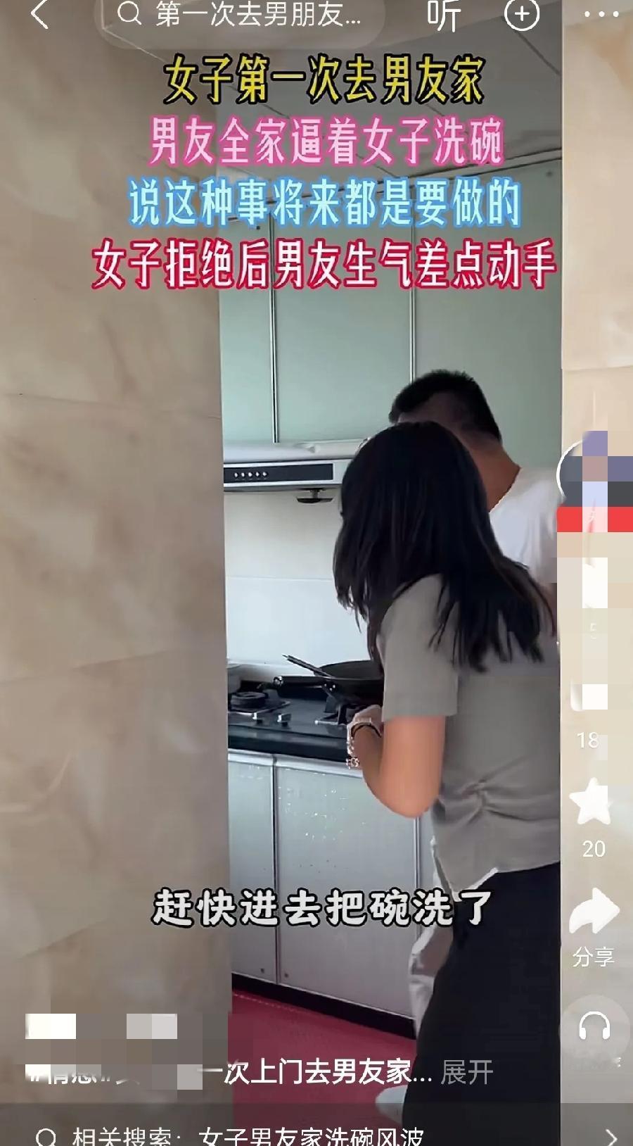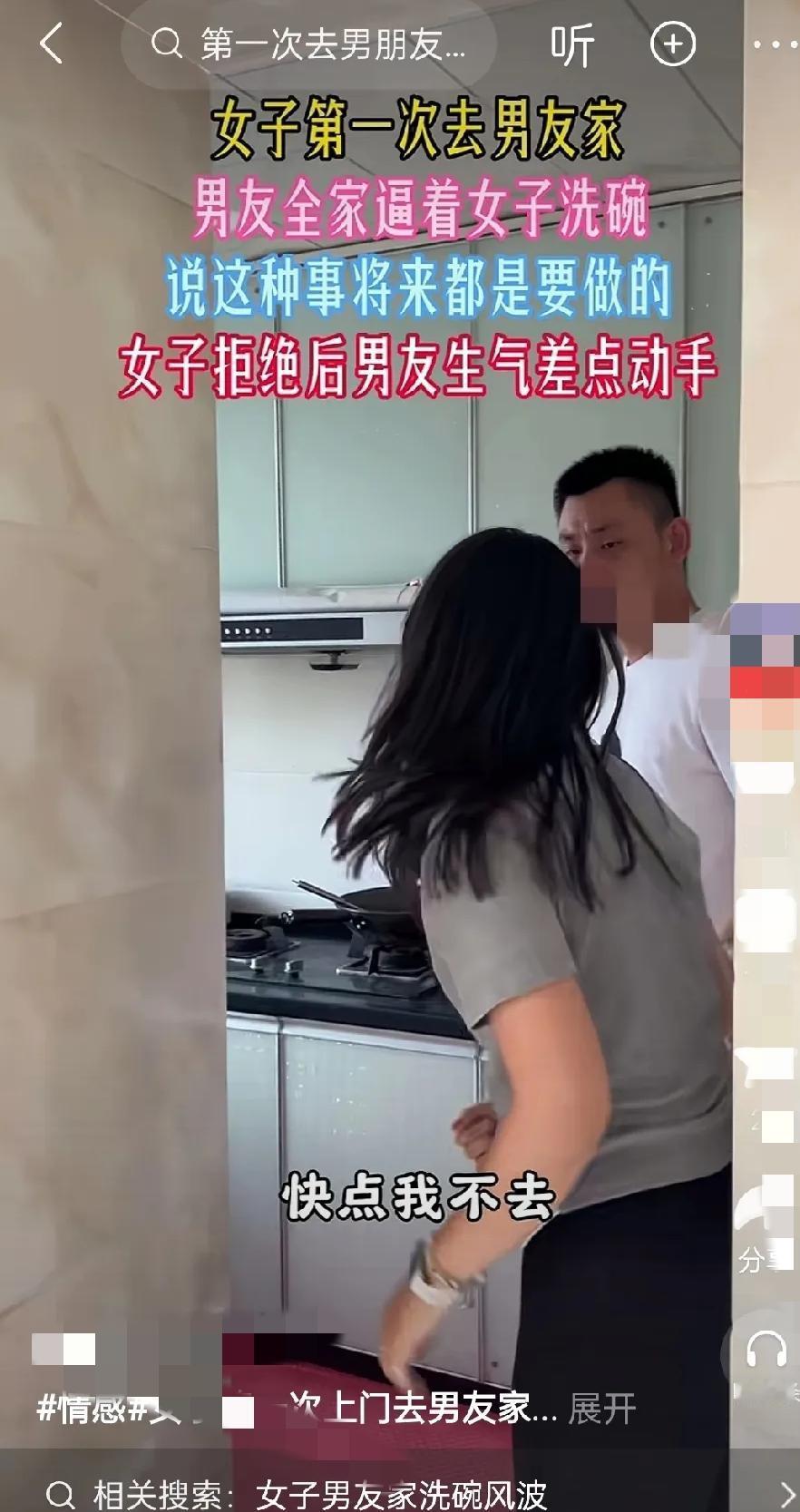 一女子第一次去男友家, 本想着是温馨会面, 结果吃完饭男友全家竟逼她洗碗! 女子不洗,这很正常吧?又不是去当免费保姆。男子还拉她,女子甩脸拒绝,男子差点动手,事后直接提分手,理由是女子不洗碗不是贤妻良母。 这男方一家也太离谱了吧,第一次上门就把人当佣人使唤,男方还拎不清,不分青红皂白,轻易被家人带偏,暴露了大男子主义和不尊重女性的本质。 这哪是找女友,分明是找免费劳动力。要是我,遇到这种家庭和男人,跑得比兔子还快。大家说,这女子做错了吗 ?
