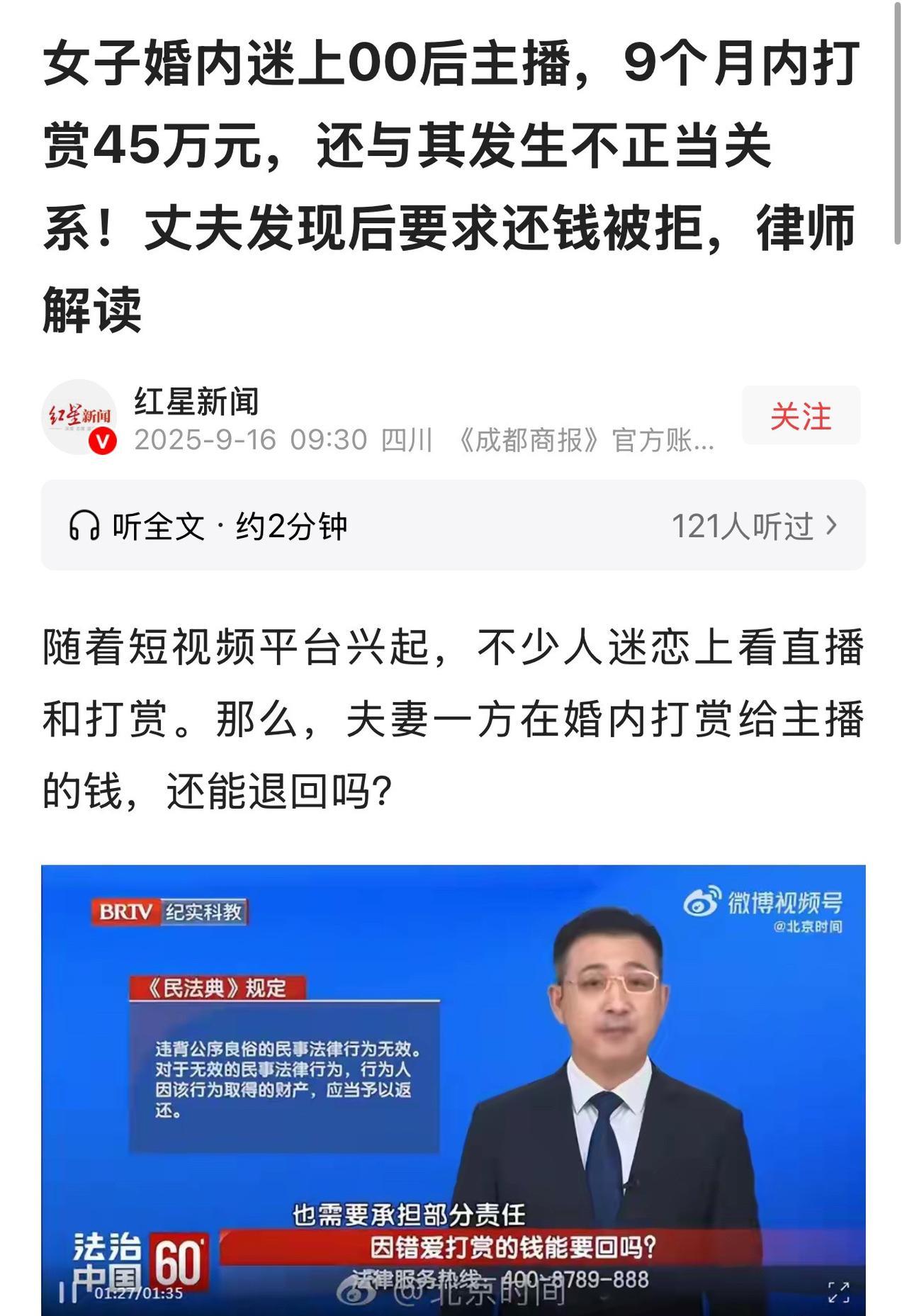 北京,已婚女子迷上了00后男主播,9个月内,就先后在其直播间打赏了1.8万次,共打赏了45万元,还与其在线下见面,并保持不正当关系。被女子丈夫发现发现后,丈夫愤怒不已,找到男主播,以妻子打赏的钱是夫妻共同财产为由,要求全额返还。男主播却说:打赏是“娱乐消费”,拒绝返还。 杨先生与高女士结婚多年,日子虽不算大富大贵,却也过得踏实安稳。 可谁也没料到,高女士在刷短视频时,刷到了00后主播小孙。 小孙年轻帅气,嘴还特别甜,直播时要么唱首情歌,要么和粉丝唠嗑,几句话就把高女士哄得团团转。 起初,高女士只是偶尔给小孙刷几块、几十块的小礼物,权当图个乐呵。 但越往后越不对劲,她像是着了魔,每天雷打不动守着小孙的直播间,只要小孙说一句“家人们帮忙点点关注”“喜欢主播就送个小心心”,她就忍不住大手笔打赏。 有时候小孙直播到半夜,她也熬着夜陪着,打赏记录一条接一条,从几百块的“火箭”到几千块的“嘉年华”,眼睛都不眨一下。 短短9个月,高女士前前后后打赏了18000多次,算下来金额竟超过45万!要知道,这笔钱并非她的私房钱,而是她和杨先生的夫妻共同财产,俩人平时过日子、养孩子、攒钱养老,全靠这笔钱撑着。 被小孙迷得五迷三道的高女士,不光在线上砸钱,还偷偷和小孙见了面,俩人发展成了不正当关系。不过,他们的行为很快就被杨先生发现了。 那天,杨先生要通过银行卡转账,登录手机银行后,突然发现卡里的余额少了一大半。 他赶紧查了流水,才看到一笔笔钱全转到了直播平台的账户里。 杨先生又惊又气,拿着流水单质问高女士,高女士起初还想隐瞒,架不住杨先生的追问,才哭哭啼啼地说了实话。 得知真相的杨先生,对妻子既失望又愤怒。他来不及纠结是否还要和妻子继续走下去,眼下最要紧的是追回这笔钱,这可是他们这么多年的血汗钱,就这么轻易到了别人兜里,他实在不甘心。 杨先生当即让妻子去把钱要回来,可高女士要么支支吾吾,要么说“钱都花出去了,哪有要回来的道理”,根本不肯去。 一气之下,杨先生只好自己联系上小孙,开门见山地要求对方返还45万,明确表示这笔钱是夫妻共同财产,并指出他和自己妻子有不正当关系。 谁知小孙态度格外强硬:大哥,你这话就没意思了吧?高姐打赏我,是因为喜欢我的直播,这是正常的娱乐消费,哪有消费完了还往回要的?再说了,我和高姐就是普通的主播和粉丝关系,你可别乱造谣。 不管杨先生怎么说,小孙都一口咬定“打赏是消费”,坚决不肯还钱。 没料到对方如此厚颜无耻,杨先生决定通过法律程序维权。 那么,我们从法律的角度,来认定一下此事? 1、杨先生以这笔钱是夫妻共同财产为由,是否可以要回这比打赏? 《民法典》第1060条第1款更是确实规定:夫妻一方因家庭日常生活需要而实施的民事法律行为,对夫妻双方发生效力,但是夫妻一方与相对人另有约定的除外。 简单说,夫妻结婚后挣的工资、奖金这些钱,都算两人共有的,要动大钱得双方都同意。 具体到这个案子里的直播打赏:要是打赏就是单纯给主播钱,数额大的话,另一方确实能找主播要回来。 但问题是,直播打赏用的是平台虚拟道具,花钱买这个主要是为了图个开心、得点精神满足,这其实算“消费”,不是单纯“送钱”。 而且,用户在平台充值打赏,是和直播平台签了服务合同,钱先给平台,主播拿的是平台发的报酬,和打赏的用户之间没有直接的金钱往来关系。 所以,杨先生想以“这是夫妻共同财产,妻子不能单独打赏”为由,让主播小孙退钱,一般情况下,法院很难判小孙返还。 2、那是不是孙先生就要不回来这笔钱了呢? 《民法典》第153条规定,违反法律、行政法规的强制性规定的民事法律行为无效。但是,该强制性规定不导致该民事法律行为无效的除外。违背公序良俗的民事法律行为无效。 本案的核心关键在于,高女士与小孙并非仅为表面的粉丝和主播关系,两人还在线下维持着不正当男女关系。 因此,只要杨先生能拿出确凿证据,证明妻子与小孙存在这种不正当关系,法院通常会认定,高女士的打赏行为违背了社会公序良俗,进而判决该打赏行为无效,并支持杨先生要求返还相关款项的诉求。