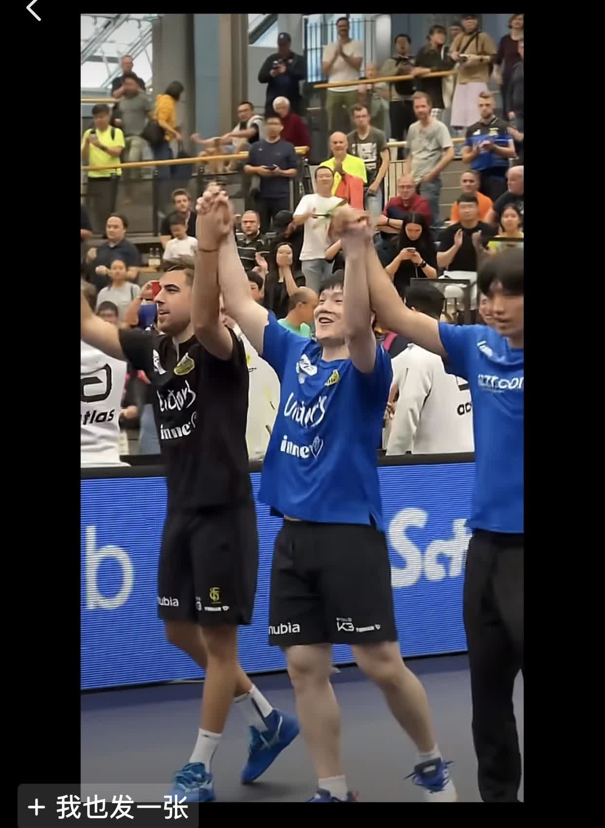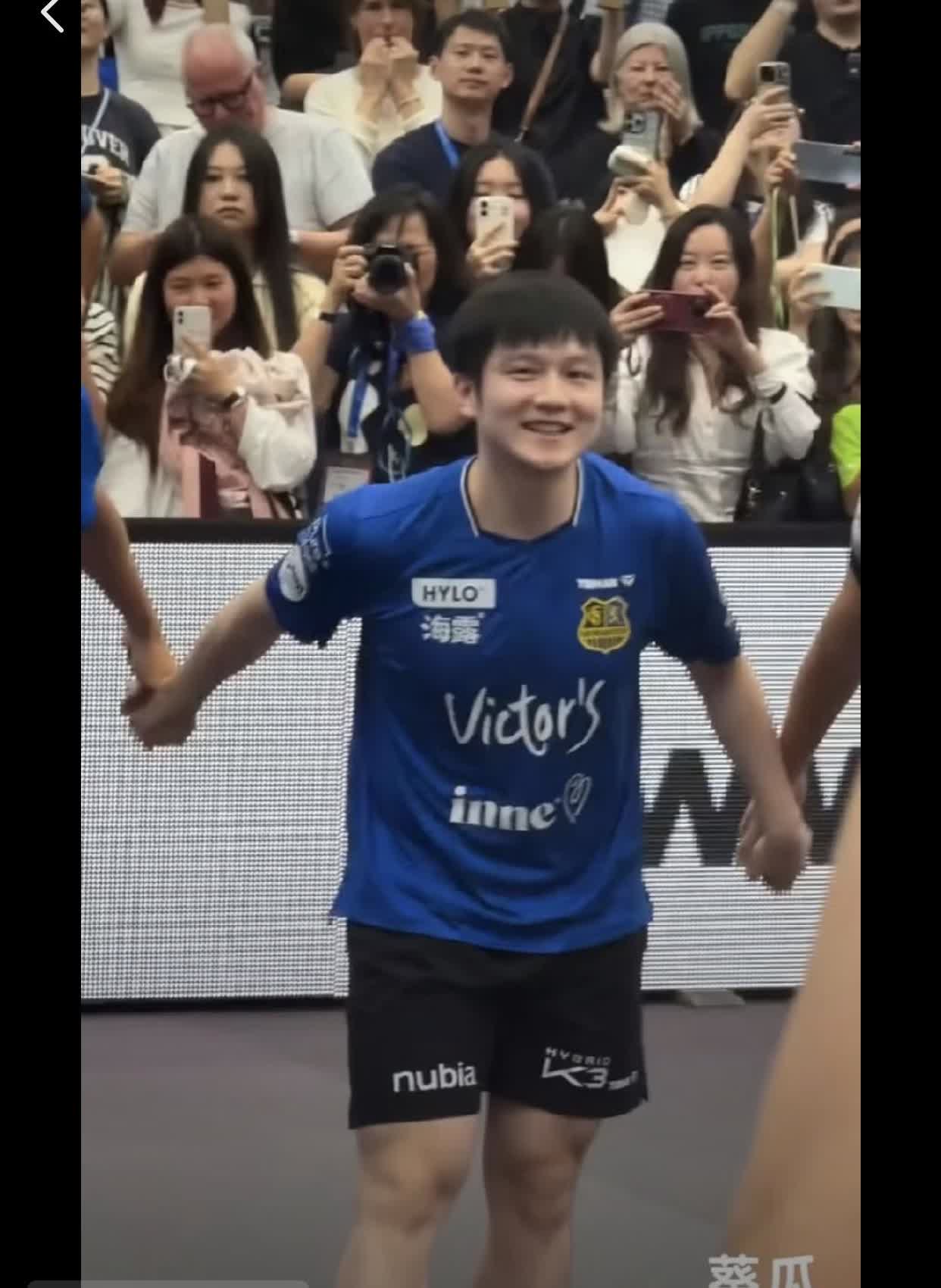 昨晚的德甲出场没有球童,当樊振东出场时,两边夹道欢迎,工作人员指引着东哥入场,东哥第一出场,3:0击败对手。 赛后东哥好开心啊,和队员牵手手玩庆祝方式,向观众致谢。 东哥又变年轻了,由28变18,在国内打球,看着像是38。 给东哥开心的啊,打的是乒乓球,谢的是足球幕[憨笑]