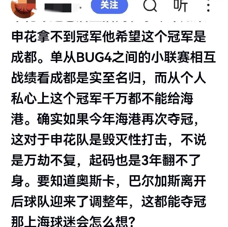 申花“恐海症”何解 瞧,申花“知名”的球迷上半赛季还喜不自胜,可从8月至今却厄运不断,情绪一落千丈。之前常能听到的提前几轮夺冠的说法,如今已不见踪影。他们满心忧虑,生怕今年又一次四大皆空。 于是,慌不择路便有了“千万不能让海港夺冠”的“期望”。其理由看似堂堂正正:“申花拿不到冠军,希望成都能拿”。 为何要抵制海港?这理由合理与荒谬并存:海港即便放走了奥斯卡、武磊受伤,依旧能夺冠,这会给申花带来毁灭性的打击,起码3年翻不了身。 为了能翻身,唯有一计:申花下场与成都对决时举白旗,保证成都至少领先海港2分。 想想蛮好笑,知名是这种…