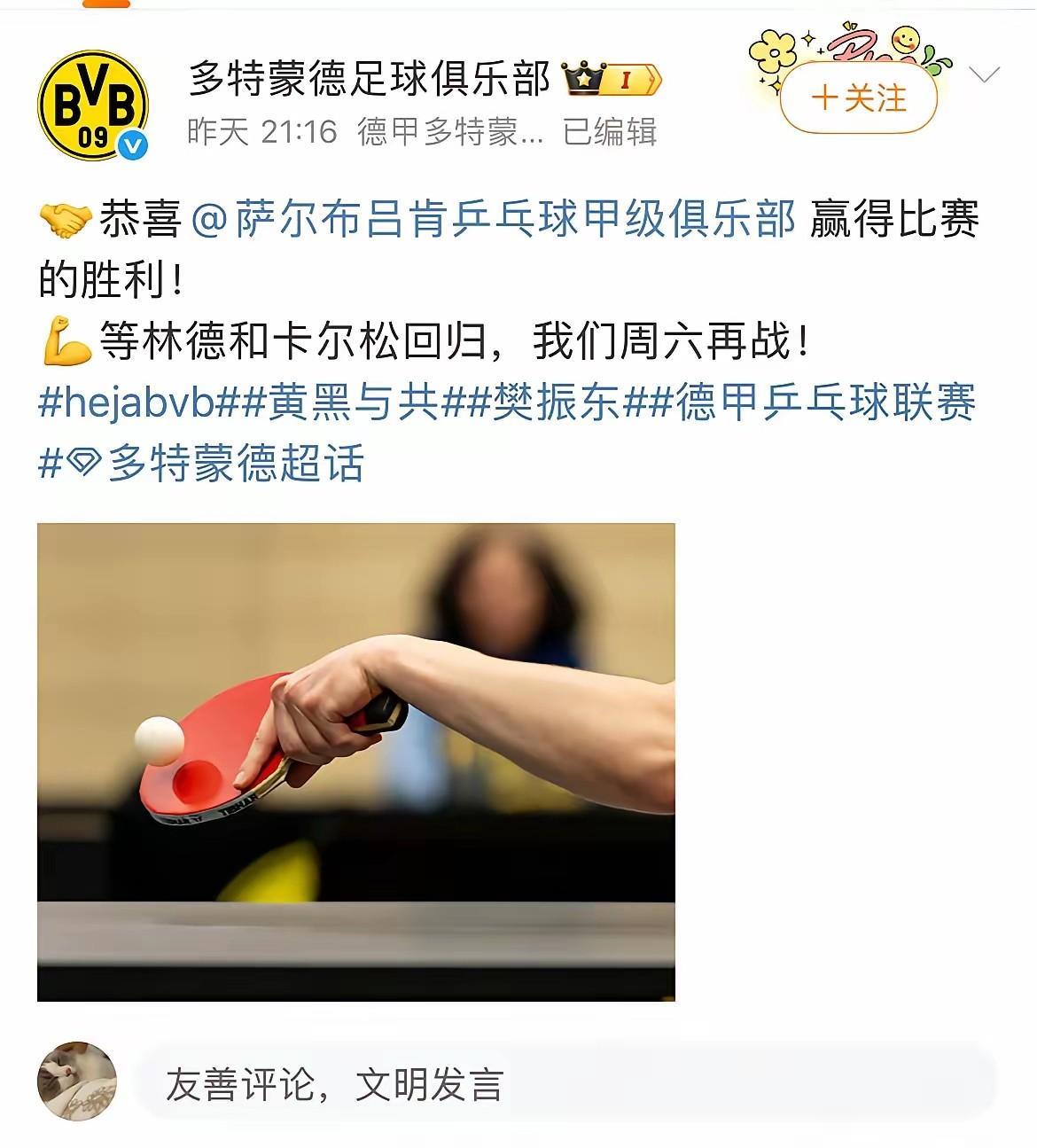 坏了,樊振东惹麻烦了! 弗朗西斯卡去澳门打冠军赛, 东哥临时带上队长袖标, 一不小心把对手, 多特蒙德打了4:0, 现场球迷纷纷倒戈, 给樊振东鼓掌, 就连多特蒙德俱乐部小编也倒戈了, 发文祝贺萨尔布吕肯胜利! 并挑衅说: 林德,卡尔松马上回来了, 周六再战! 一个足球俱乐部发文, 难道约东哥踢足球吗?