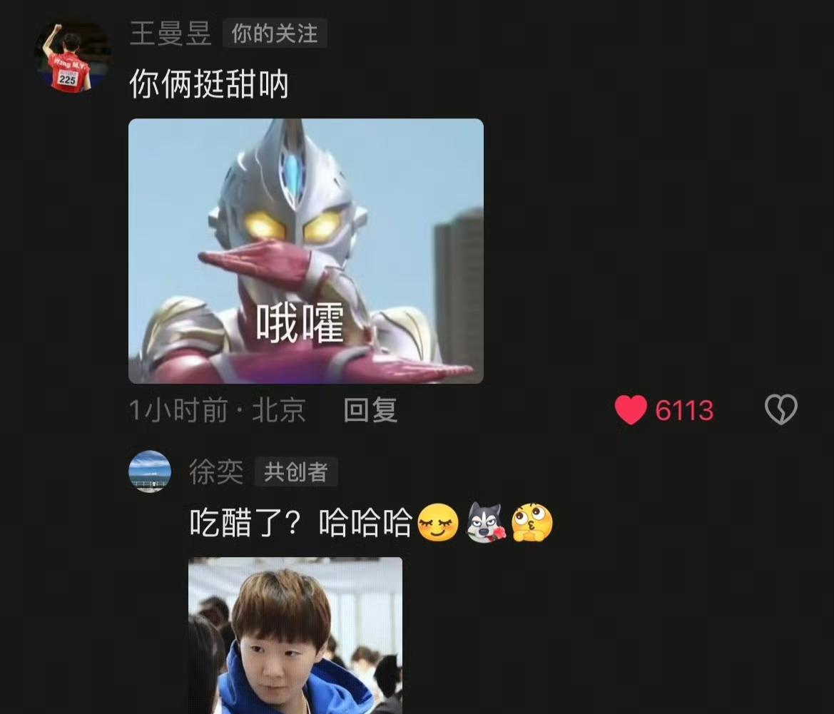 都知道王曼昱、陈熠、徐弈关系好!特别是俩妹妹是王曼昱最坚定的拥护者!但今儿俩人居然撇下王曼昱出去玩了! 玩就玩,还专门发个圈刺激她! 王曼昱酸溜溜的回复:你俩真甜啊!还配个奥特曼的图片! 徐弈也回复:吃醋了?配个王曼昱的表情包! 不得不说,太可爱了! 虽说,三人行必有争风吃醋,但王曼昱却说:不跟俩孩子计较!#王曼昱# #陈熠# #徐弈#