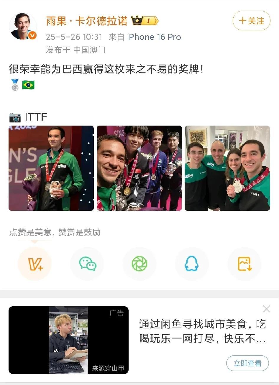 雨果发文,终于主动晒出与王楚钦合照! 澳门世界杯,他夺冠后,晒图10张,没有一张