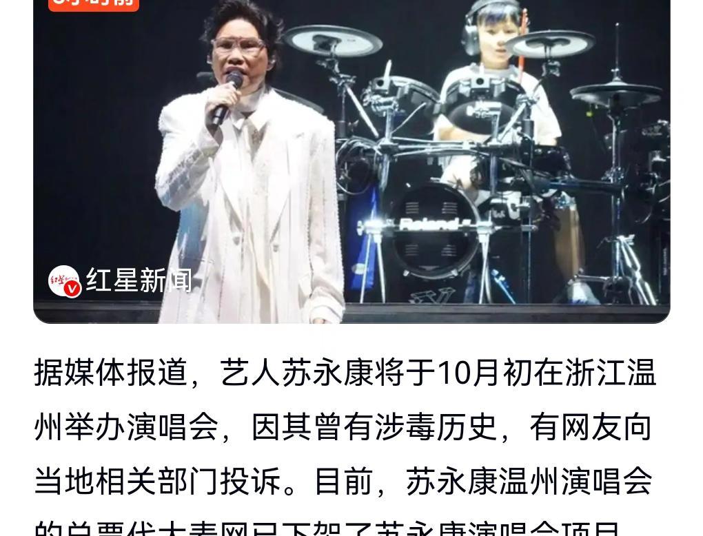 涉毒艺人能不能重出江湖,要有一个制度。 我觉得就不应该让他们重出江湖。 要是苏永康能重出江湖了,那莫少聪、孙兴是不是也可以重出江湖? 所以说一视同仁,一个都不能让他们付出。 9月16日消息,涉毒艺人苏永康温州演唱会取消。 取消就对了。 遭受到很多网友的投诉后,主办方决定申请取消苏有康的演唱会。 本来就不能够让他开演唱会,也不知道上面当初是怎么审批的。