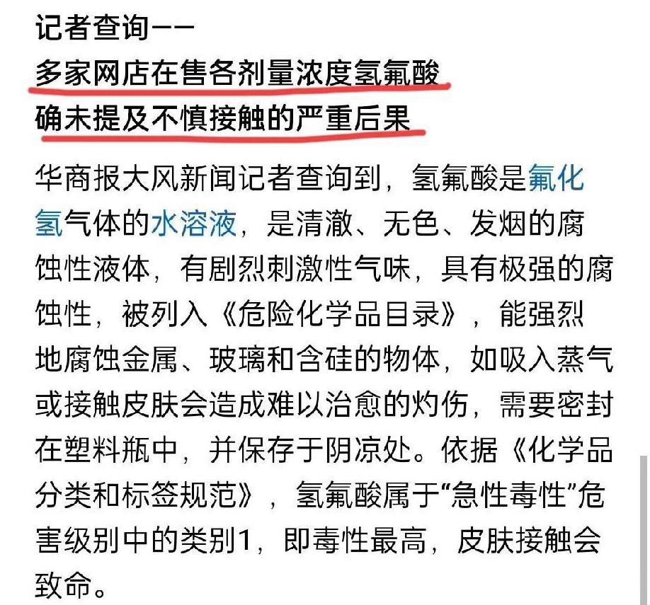 多家网购平台有售!开什么玩笑?这玩意儿小名可是化骨水,怎么可能在电商平台能随便买到? 刚才看到媒体报道,据记者的调查,在多家的网购平台都可以买到这种小名化骨水的氢氟酸溶液,并且没有什么特别的限制,也就是说,就和买普通的商品一样。 商家在详情页里,主页里面也没有写明特别注意事项,只是说要带着手套操作,不要粘到皮肤上,粘到皮肤上,以后要及时用清水洗掉。 还有商家,在详情页里,竟然写上了免责声明,意思就是说,只要你去买了,就说明你具备一定的化学知识,出现任何不良后果和伤害,都由自己负责,商家不负任何责任。 当然,他的这个声明肯定是无效的,但是这不是问题的所在。 问题是,为什么这个在化学品名录里位居一类危险品的剧毒物,能够在普通的网络平台随便买到? 这个难道不是应该被监管的吗?这个东西如此的危险,无论销售者还是购买者,都是应该有备案记录的,销售了多少?销售到哪里?购买者必须要实名,使用了多少?用在了什么地方?还剩余多少?在哪里储存? 怎么可能像洗衣粉洗衣液一样随便买呢? 各位网友,怎么看这个事呢?欢迎评论区留言讨论