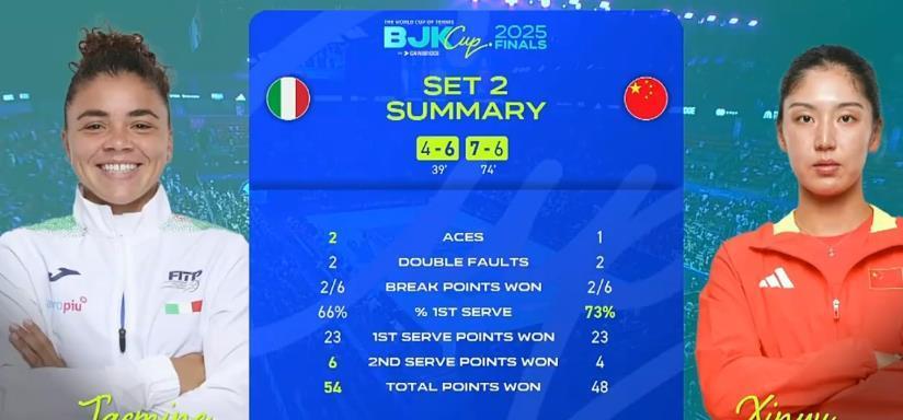 中国vs意大利,第二场 王欣瑜第二盘浪费5-4发胜, 最终保利尼回破,抢七翻盘 王欣瑜64,67保利尼 双方1-1 又是决胜盘 太难了 #网坛风云##王欣瑜#