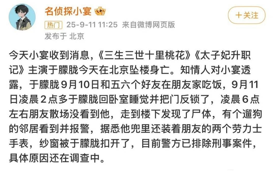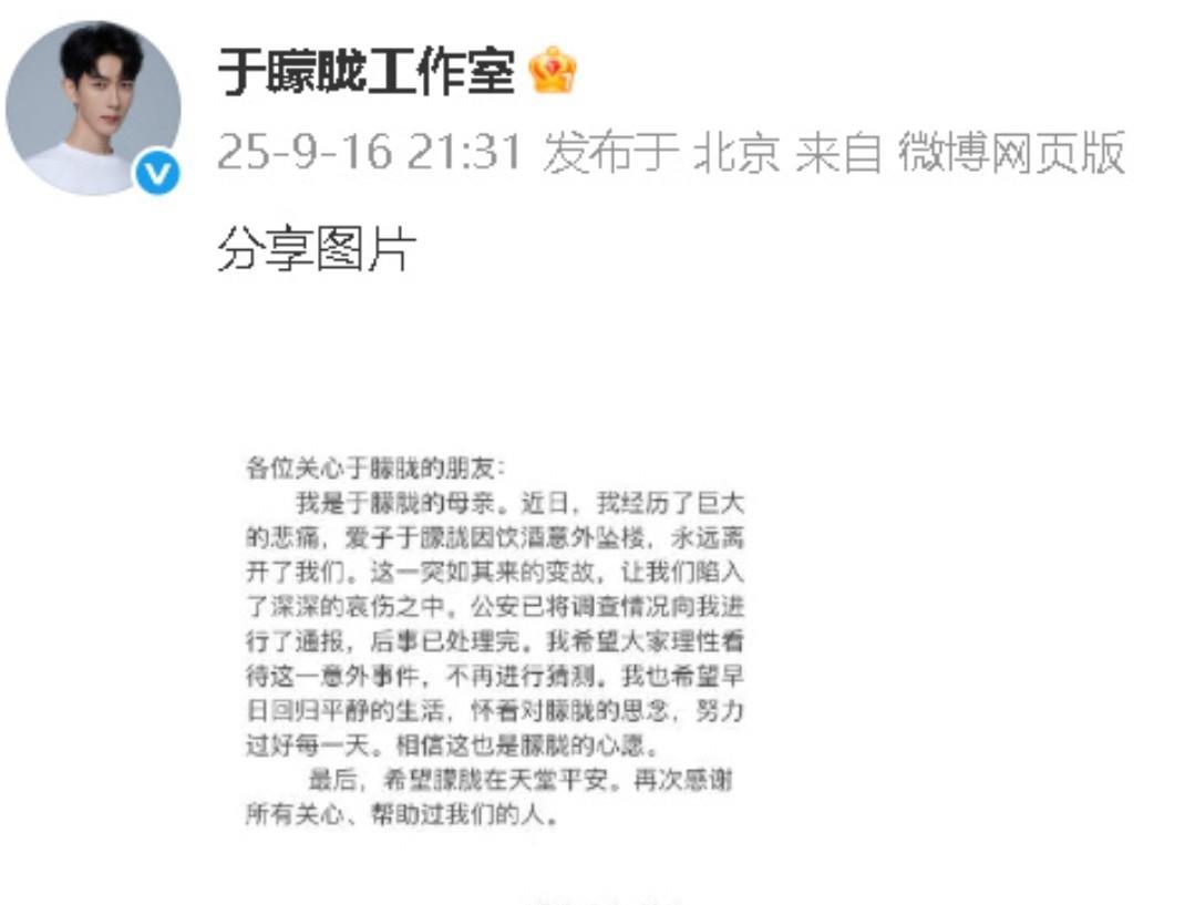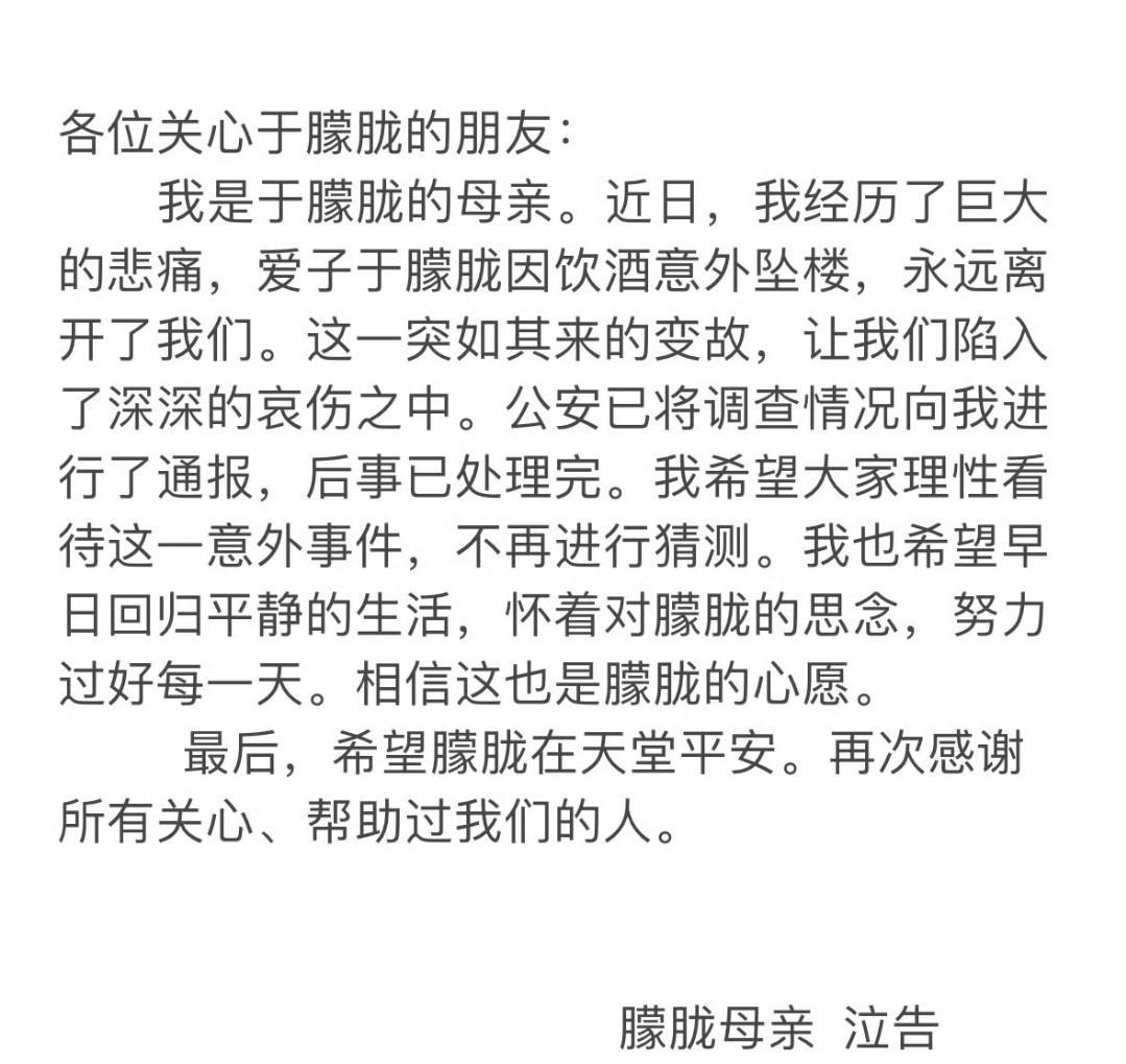 有时候,谣言这东西偏偏就有人信。 就在大家还再猜测于朦胧死因时,他母亲通过工作室发文了,称于朦胧是自己喝醉酒意外坠楼的。公安机关已将调查情况进行通报,目前后事已处理完。 此前,因为狗仔对朦胧坠亡采用锁门和兜里揣着朋友劳力士表等说辞,导致很多人猜测死因,甚至和乔任梁的死联系起来。虽然后来狗仔删文了,但仍旧有人用阴谋论揣测。 现如今,于朦胧家人亲自发文,就是要让谣言停止,可真的能停止吗?我感觉不会,虽然不可能像乔任梁那样被猜测的极端化,却也会在时间的发酵中,慢慢出现更多种说法。 目前,网上质疑声还是很多,有的在等蓝底白字通报,可我感觉如果是排除刑事案件,通报不会有的,即便有通报,还是有人不会相信。 真真假假,假假真真,只能说愿逝者安息吧。#秋日生活打卡季#