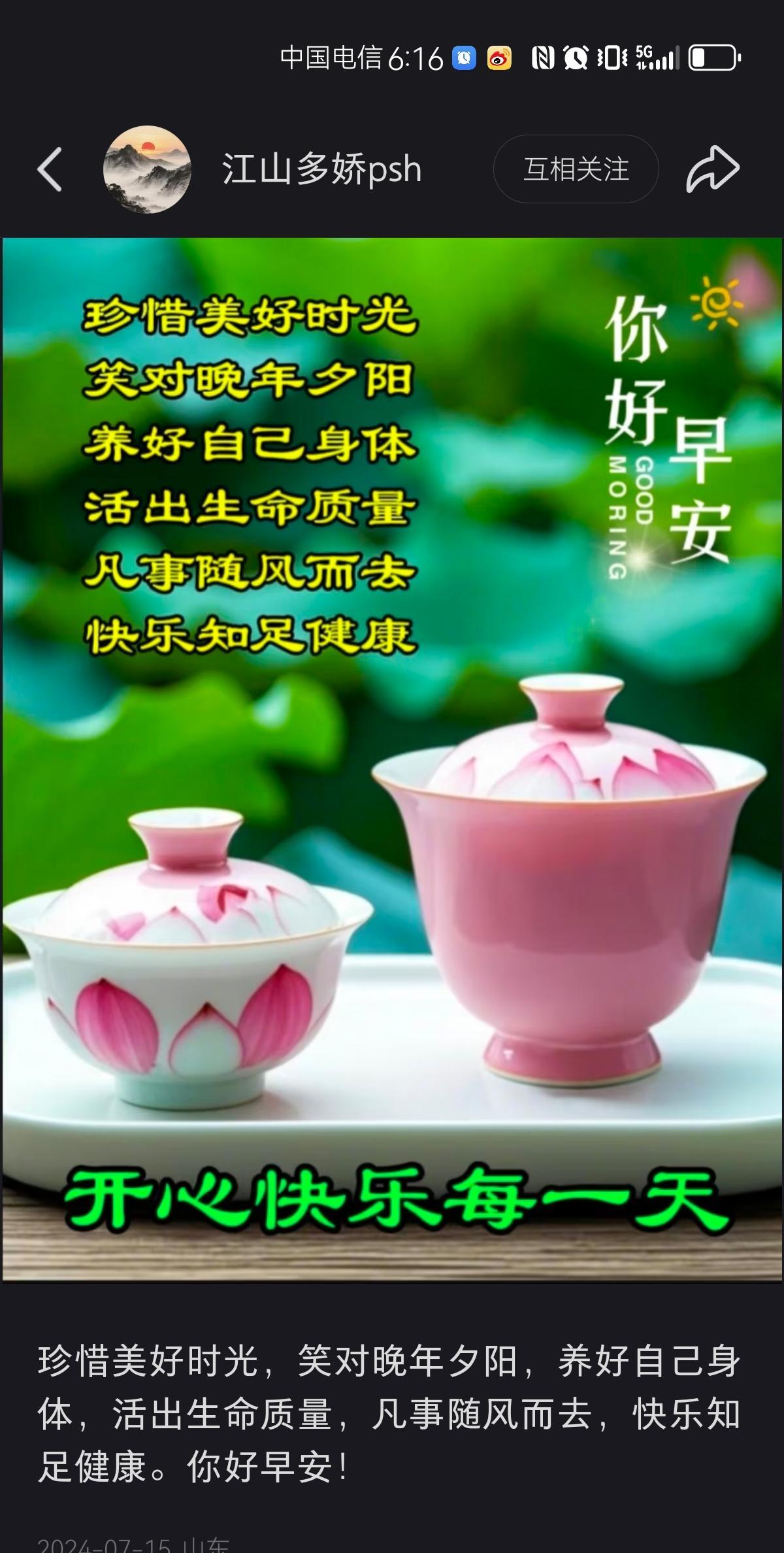 [玫瑰]早上好[玫瑰] 热爱生活的人, 生活也会赋予你能量。 当你不断探寻生命的更多可能性, 去找到你所热爱的事, 并为之全力以赴, 便能活成自己喜欢的样子。 新的一天, [太阳][玫瑰][心][微风] 暖心的问候总在早上, 相互的牵挂总在心上, 缘分让我们彼此不忘, 祝福让我们快乐安康。 ##秋日生活打卡季##