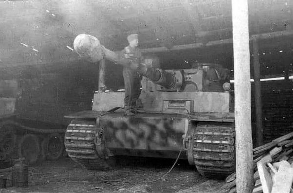 1943年底,德国国防军第502重装甲营的虎式坦克在东线一处后方设施进行例行保养和维修。 自1943年2月起,德国国防军从整体的德国灰涂装改为深黄色底色,在其上涂装橄榄绿和红棕色迷彩图案。维修人员用喷枪、刷子甚至拖把手工完成,因此带来了各种高度个人化和即兴化的涂装。而油漆最初以浓缩液形式下发部队,用汽油稀释后使用,但因为燃料短缺,操作者往往用水或融雪以随意比例替代,因此最终出现的色彩效果也差异巨大。