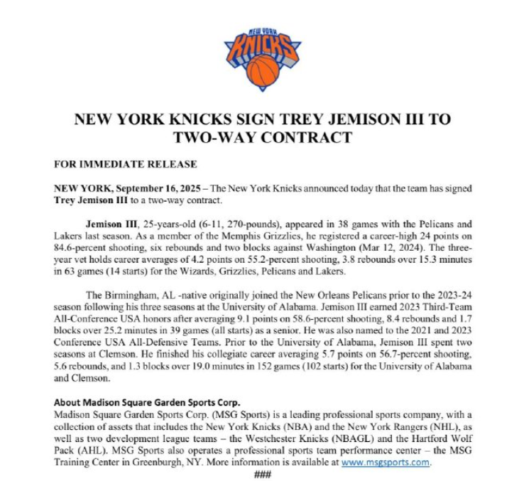 杰米森在过去两个赛季里辗转多支球队,是一名标准的NBA流浪汉。这位25岁的中锋虽然身高达到2米11,但曾被形容为“移动速度像生锈的机器人”。尼克斯在前场已经拥有卡尔·安东尼·唐斯、米切尔·罗宾逊等球员,竞争异常激烈。杰米森更多需要通过双向合同积累机会,等待球队可能出现的轮换空缺。