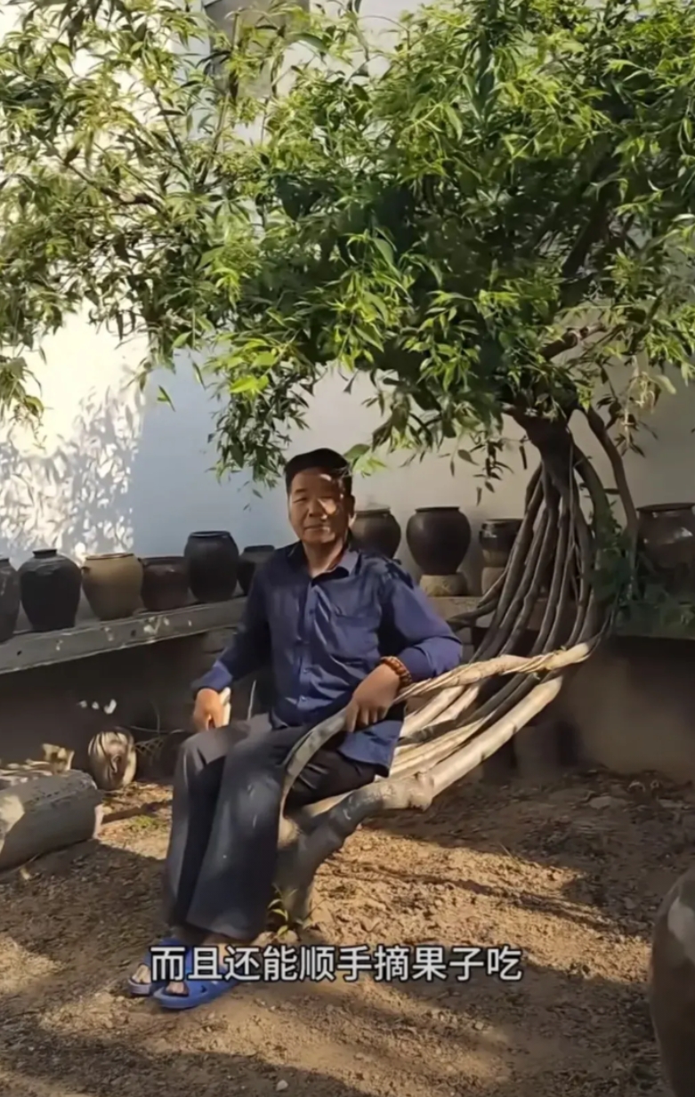 这个大爷真有才,他在自家院子里种了一颗能当躺椅的树。边睡边摘果子吃,真是太惬意了!