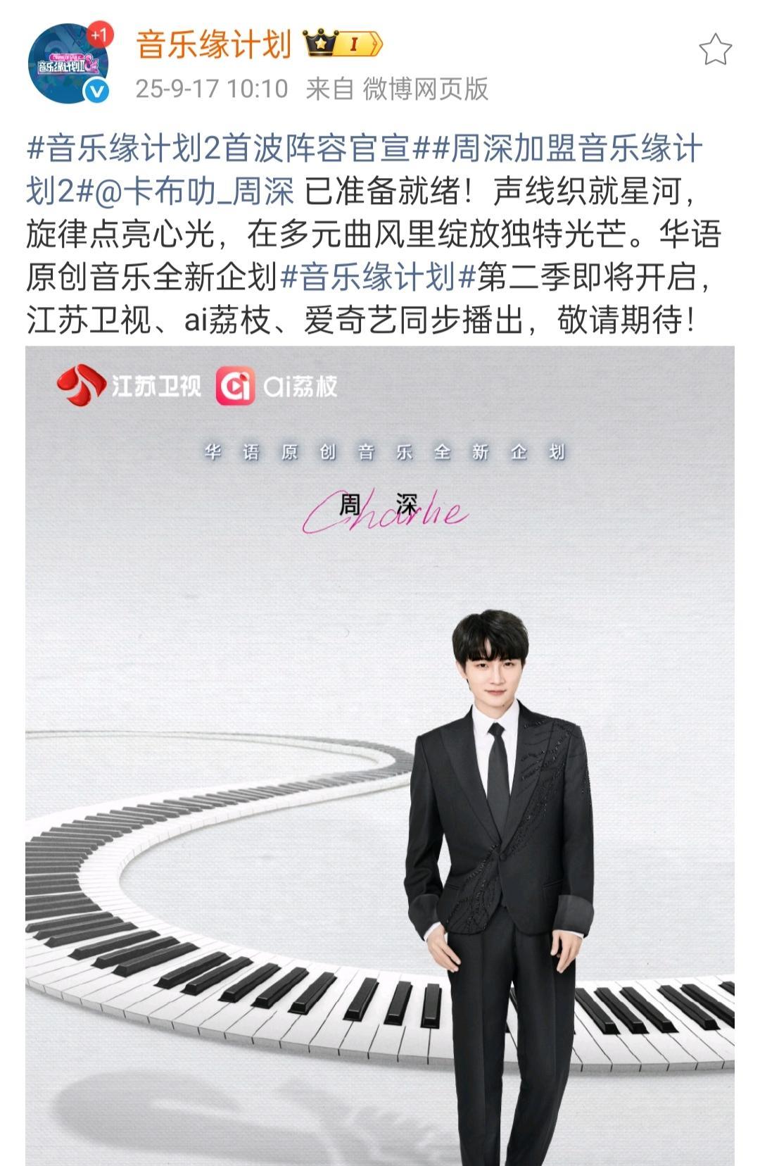 周深加盟音乐缘计划2! 官宣了! 周深加盟《音乐缘计划2》今天就开始录制了!看瓜田的是明天有发布会!晚点应该会通知的! 我的印象中周深录制的音综都只参加一季,可能是因为缘计划不一样唱的都是原创新歌! 周深是京都念慈庵普通食品全球代言人! #周深#