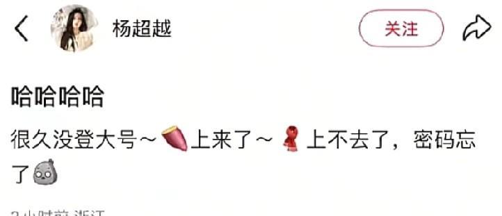 网友们看到杨超越的发文后,都傻眼了,没想到大家之前对很久没发动态的明星调侃的是不是“密码忘了”的梗,有一天居然会成真。 不过密码忘记了直接更改密码重新登录不就行了吗?杨超越弄了一天都没弄好,是因为明星账号保密性要高一些,流程要复杂一些吗?
