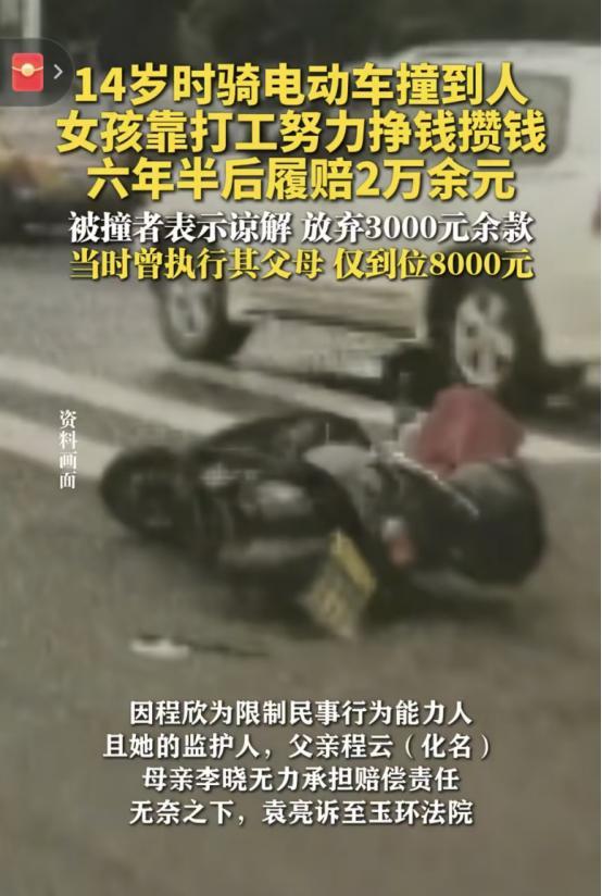 “鼻子酸了!”浙江,14岁的女孩骑电动车撞到了一名男子,需要赔偿31000块,然而女孩的父母各自再婚,能力有限只赔偿了8000块,岂料,女孩并没有忘记这件事,6年多时间拼命打工,最终存了2万块钱还给了男子,对方心里很感动,虽然还少了3000块,但最终选择不再追究,网友:一直都没忘记还钱,已经很不错了,见过太多借钱不还的! “姑娘!6年了,你还记得这件事,我已经很满足了!”六年前,小程骑着电瓶车匆匆赶路,一个分神,不慎撞倒了过路的袁先生,为了偿还赔偿债务,小程硬是用了6年的青春,坚守这份责任! 车祸发生后,袁先生的胳膊和膝盖擦伤严重,去医院检查后发现还需要进一步治疗。最终核定赔偿金额为31000元。对于这个数字,小程面露难色,但还是咬着牙说出:“我……我会想办法的!” 殊不知,她的父母早已各自组建新家庭,经济能力有限,法院执行后,两家凑了8000元便再也拿不出更多!袁先生看着眼前窘迫的一家人,叹了口气,便没再逼迫。 然而,这笔未了的债,像一颗石头,沉沉地压在了小程的心底。之后的六年,她辍学、打工,在餐厅洗过碗,在流水线熬过夜,每个月最开心的事就是往存折里存上一笔钱。当同龄人在享受青春时,她却在计算工时;当别人沉浸于购物娱乐时,她却把微薄的薪水小心存起。 “过去这么久了,说不定他早就忘记了,何必苦了自己!”多年来,身边不是没人劝她,可她总是对此摇摇头,声音坚定的回答。在小程看来:是自己的责任就应该承担,犯了错就要接受后果。 “对不起,还差三千,我真的只能攒这么多了!”六年后的一天,小程终于攒够了2万余元,她通过当年的事故处理记录,几经周折找到了袁先生。见面时,她从包里拿出用信封包得整整齐齐的现金,递了过去,并深深地鞠了一躬! 在了解小程的情况后,袁先生备受感动,他百感交集,接过那份沉甸甸的信封,虽然,距离总额还差3千元,但袁先生表示谅解,不再追究,在他看来:时隔六年,小程依然记得此事,这份坚持与善良,已经足矣! 事后,小程的母亲得知消息后,又再次表达感谢,再婚后,小程的母亲成为了一名全职太太,没有收入来源,又有三个孩子需要照顾;而小程的父亲更是有另一个家需要照顾,生活同样艰难。 只能说,在这个诚信有时,会被轻易抛诸脑后的时代,一个女孩用六年的坚持,诠释了什么叫一诺千金。而受害者的宽容与谅解,则让这个关于担当的故事,有了一个温暖的结局。生活或许会有意外,但善意与诚信,永远是最动人的选择。 对此,您是怎么看待这件事的呢? 信息来源: 安徽商报|《14岁时骑电动车撞到人,女孩靠打工努力挣钱攒钱,六年后履赔2万余元,被撞者表示谅解,放弃3000元余款,当时曾执行其父母,仅到位8000元》 文|梅林 编辑|南风意史