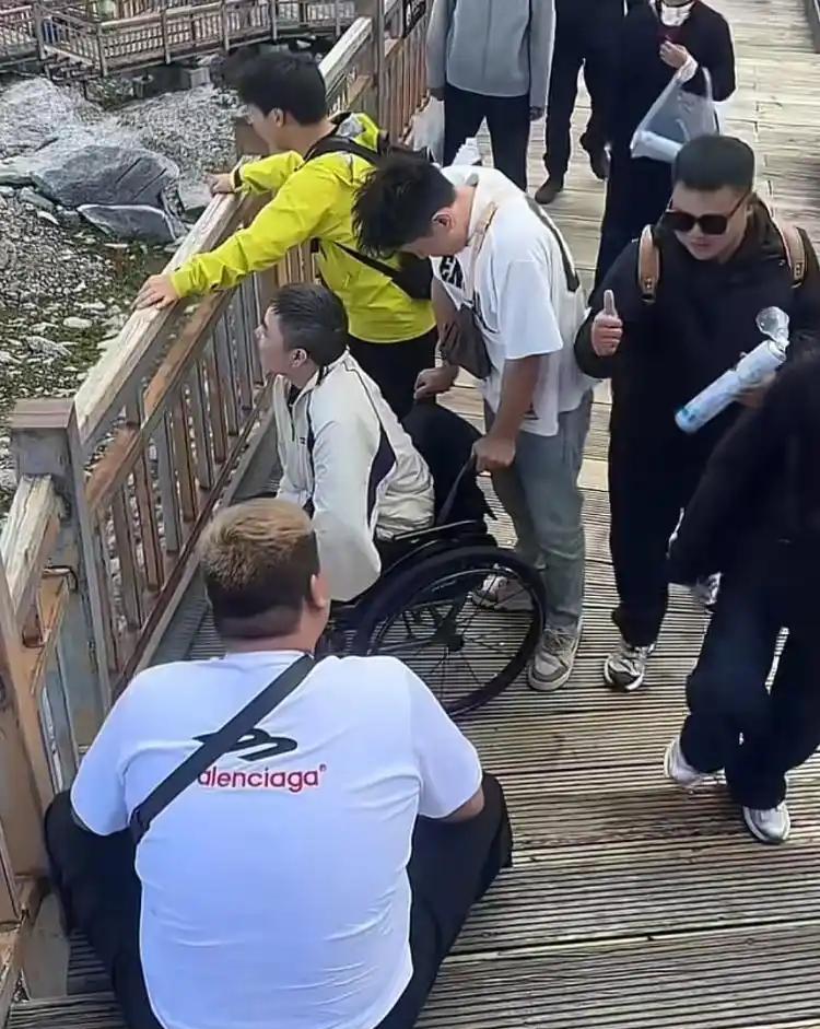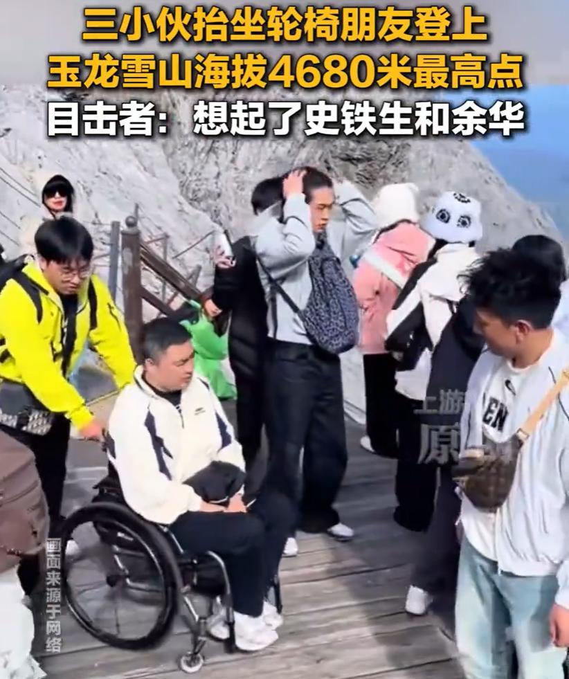 这就是兄弟情!云南丽江,一女子在爬玉龙雪山时突然看到一个感动画面,别人都是一边爬山一边吸氧,可有三名小伙抬着轮椅带因车祸残疾的好友成功登顶玉龙雪山4680米观景台,女子直言:让我想起了史铁生和余华 黎女士介绍,当天玉龙雪山有一点雪,天气不错,自己乘坐索道来到4506米,然后往4680米处攀登。偶然看到三名年轻男子正轮流推着一架轮椅,一步步向上攀登。轮椅上坐着一位朋友,行动不便,神情却明亮 周围有人喘着气吸氧,有人坐在台阶上休息,而这三个人却始终稳稳地扶着轮椅,一步一步,向上走。陡峭的木栈道、冰冷的风、高原的缺氧……都没有让他们停下。 沿途不少游客被这一幕打动,有人主动让道,有人出声鼓励,还有人悄悄拿起手机记录下这并不寻常的“登山方式”。最终,他们真的把轮椅推上了4680米的观景台 有网友说:那段阶梯我自己爬都费劲,爬十几级就要歇会儿,他们居然抬上去,这就是情谊吧 确实如此,玉龙雪山那段登顶的阶梯,很多人体会过。走几级就要歇一歇,喘口气、吸口氧,心跳快得像要蹦出来 而他们三个人抬一个人,体力的消耗可想而知,但他们没有放弃,反而把朋友的心愿当成自己的事,硬是把路走完了。这背后没有华丽的理由,就是不愿让兄弟在雪山脚下留下遗憾 也许这位小伙的身体一时还难以恢复,但有这样的兄弟在身边,他一定不会觉得孤单。雪山上的这一幕,让人明白一个道理,人生的路上,不是每个人都能自己走完全程,有时候,能有人愿意陪你走一段,就是最大的幸运
