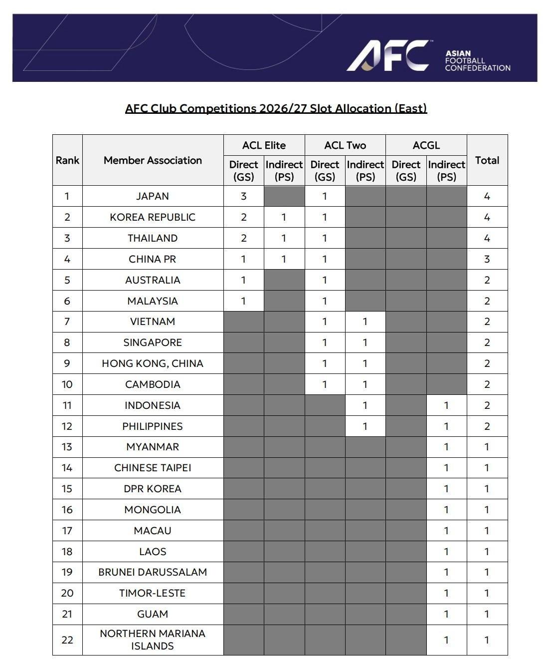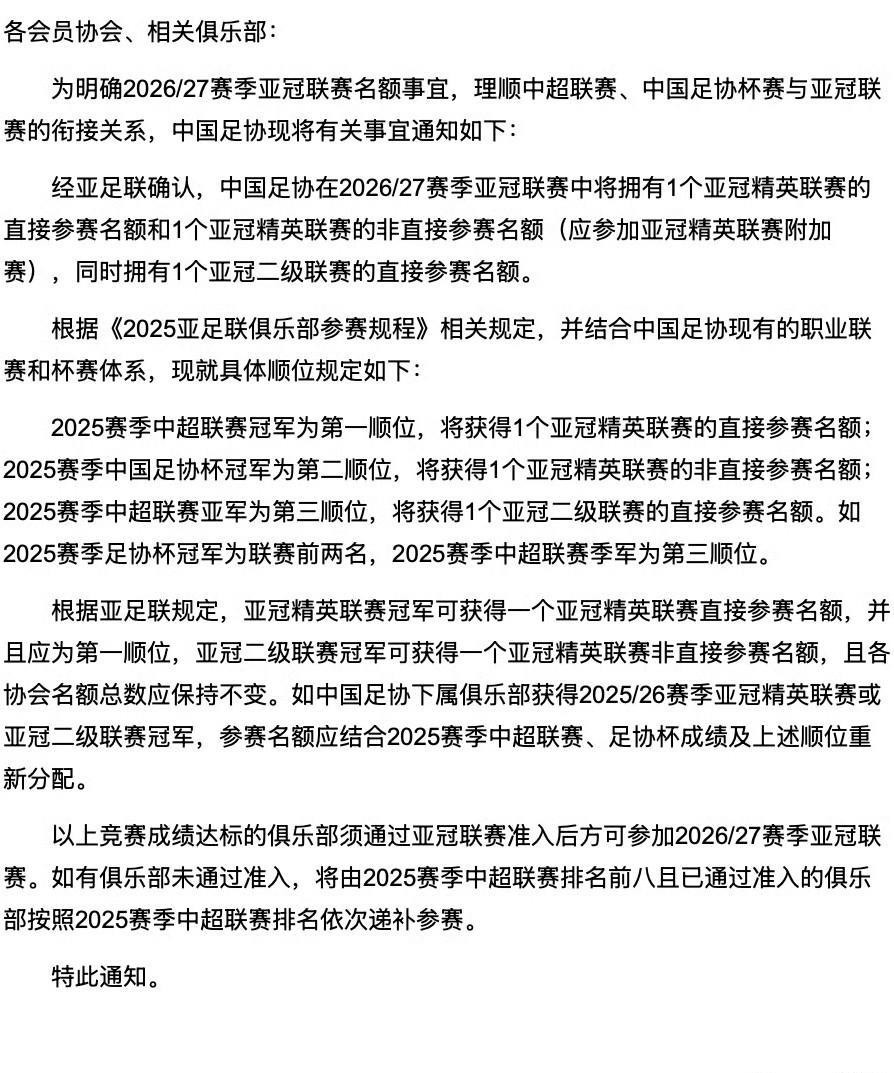 明年中超亚冠名额为1+1+1 经中国足协确认并发文通知,2026/27赛季亚冠联