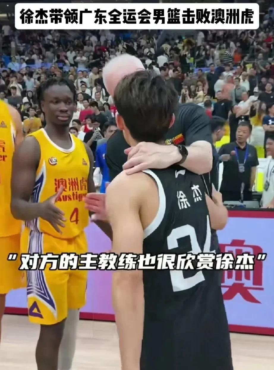 徐杰34分被对方球员和主教练称赞,赢得尊重! 近日,中奥男篮挑战赛中,广东男篮外援第二场战胜了澳洲虎球队,其中徐杰砍下34分,带队获胜。 赛后,对方球员和主教练给予了徐杰充分的肯定,对方后卫狠狠的拥抱了徐杰,对方主教练也是搂住徐杰脖,说了很多话! 徐杰确实成长了不少,投篮也准了,运球也也稳了!