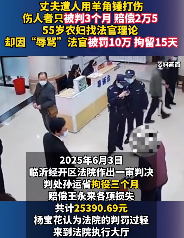 事情的起因并不复杂。杨宝花的丈夫王永来,被同村人孙运省用羊角锤打成轻伤二级。法院一审判决结果是:孙运省拘役三个月,赔偿2.5万元。说实话,这样的判罚放在很多老百姓心里,难免觉得“太轻了”。杨宝花自然不服,直奔法院执行大厅,找到承办法官质问:“为啥判得这么轻?要是你老公被打成这样,你能接受吗?”