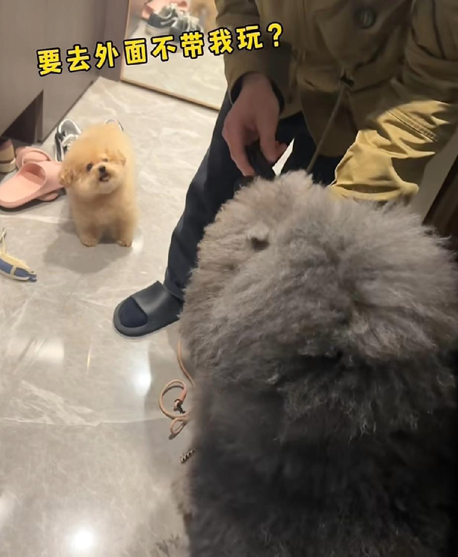 太搞笑了!主人同时带两只狗子出门,一只小比熊,一只灰毛大泰迪。这天主人操作失误,