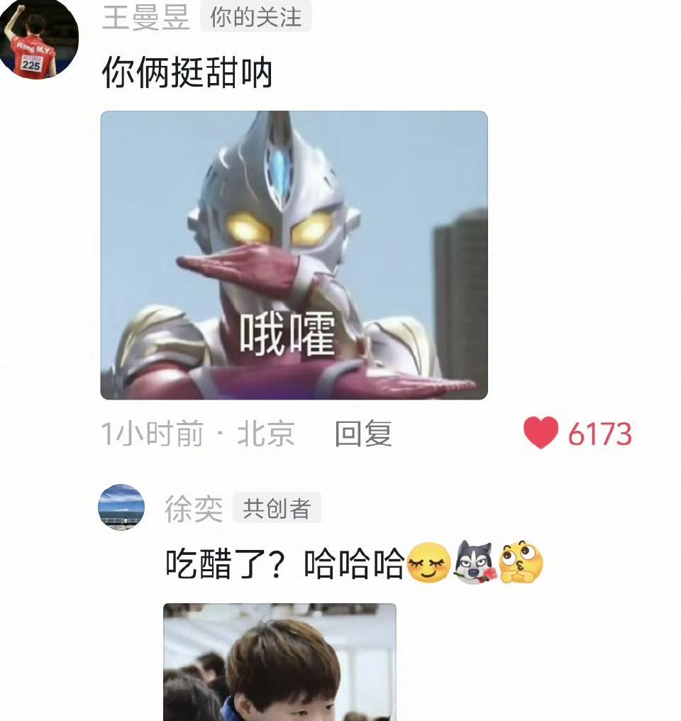 09月15日,王曼昱看见徐奕和陈熠两人十指相扣的后续来了,感觉王曼昱的醋坛子都要打翻了,直接留言: 你俩挺甜呐 没想到徐奕和陈熠也不惯着王曼昱回复王曼昱: 陈熠:别老吃妹妹们的醋 徐奕:吃醋了?哈哈哈,(并配上王曼昱的表情包) 看着三姐妹有趣又调皮的对话,可以看出三人的关系是蛮融洽的,徐奕直接拿王曼昱的表情包来调侃王曼昱,这关系比铁还硬,她俩三姐妹都是随便可以开玩笑,聊天的人,也可以感觉到王曼昱应该经常吃她俩的醋,王曼昱就是那么率真和可爱 王曼昱虽然在三人当中最大,但感觉是被陈熠和徐奕“欺负”的人,但又是被两姐妹宠着,爱着的人,相爱相杀的三人在一起,真是乐趣多多,真是太可爱了