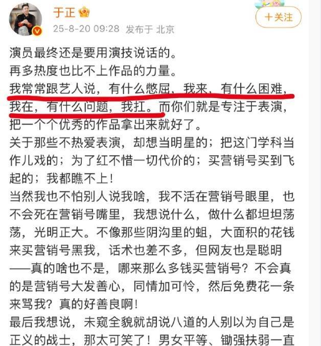 于正是娱乐圈里面最护犊子的老板?但凡出现自家艺人的黑料,他总是第一个出来维护的。 如果娱乐圈选老板的话,于正相对来说还是比较可靠,因为不管发生什么事,最后都会变成爆料人和于正一对一互殴,最后大家可能都会想不起来事为说明事情在争吵,这不失为模糊公众视线的一步好棋啊。
