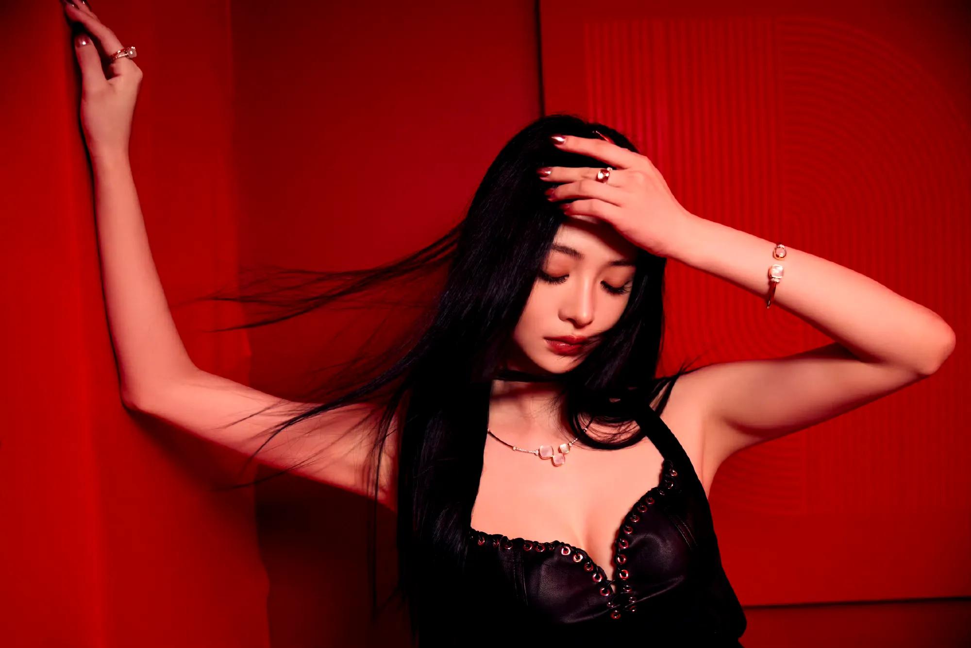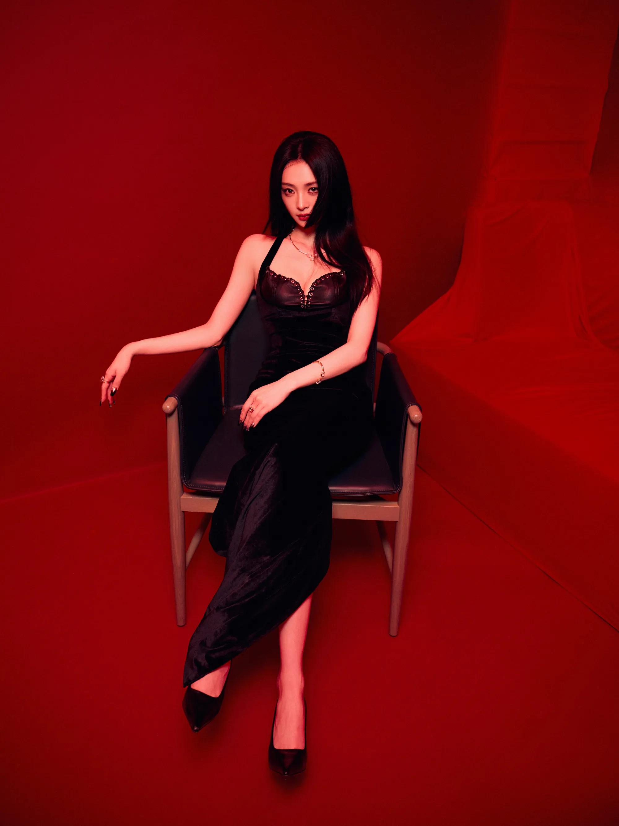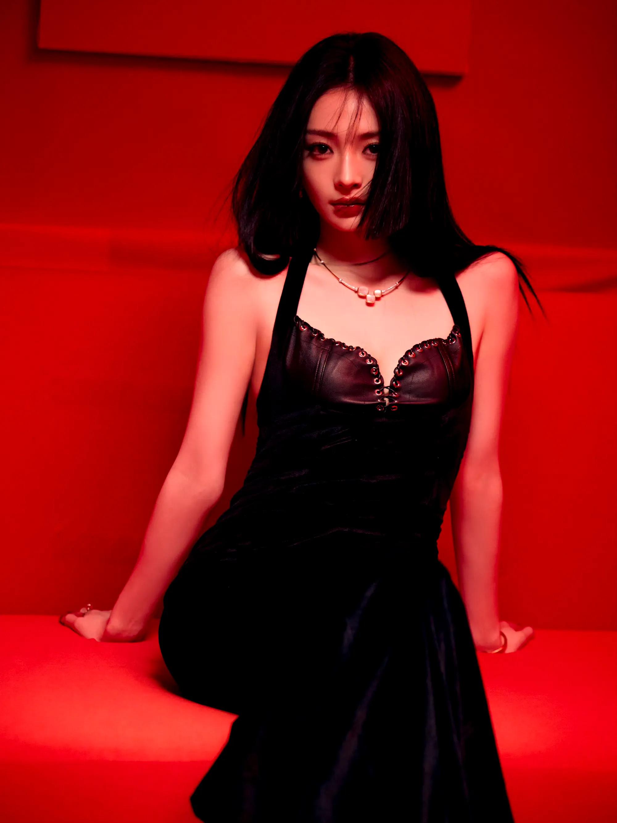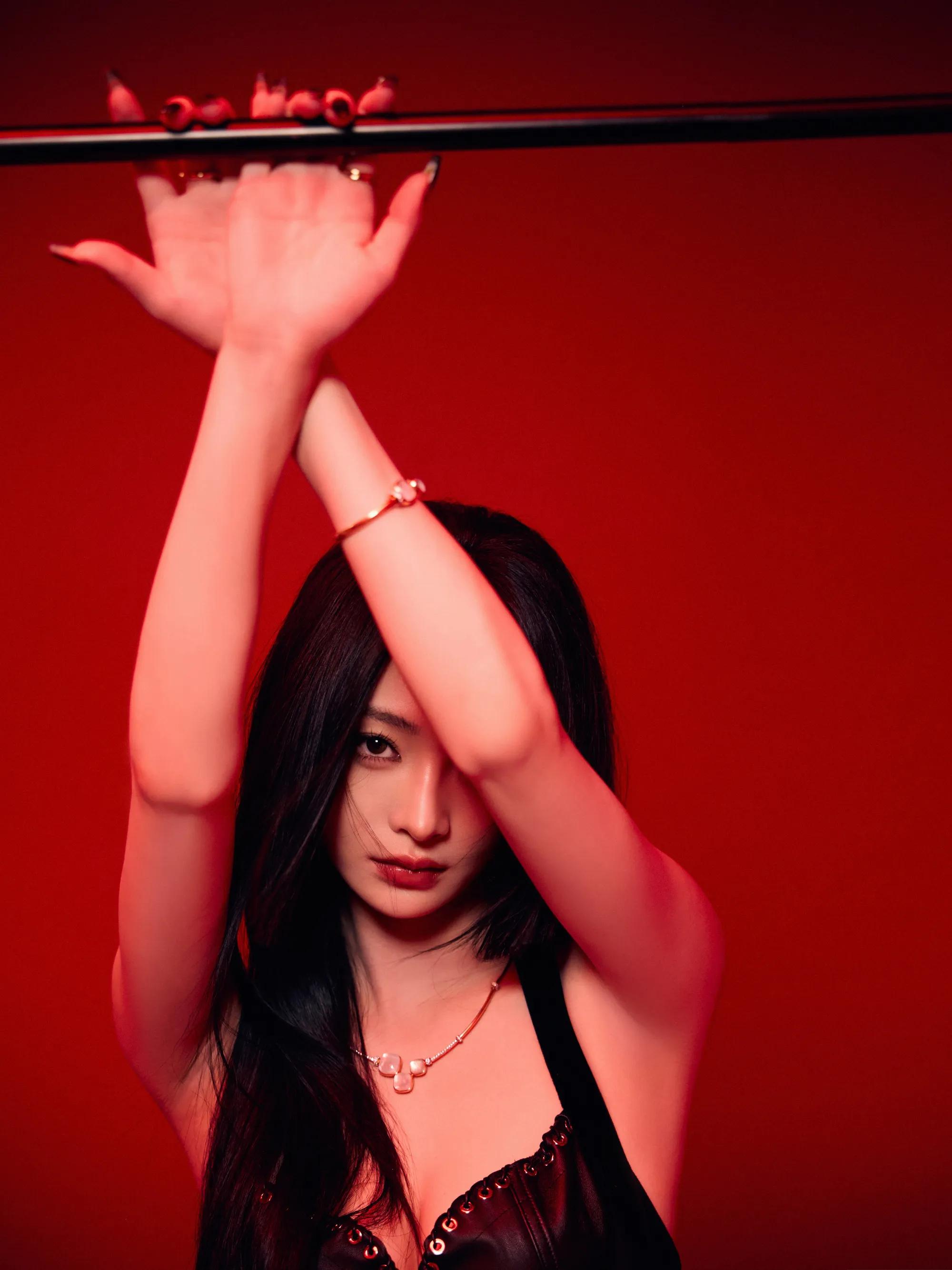 白鹿脚踩纤细高跟,戴黑色皮手套,太欲了