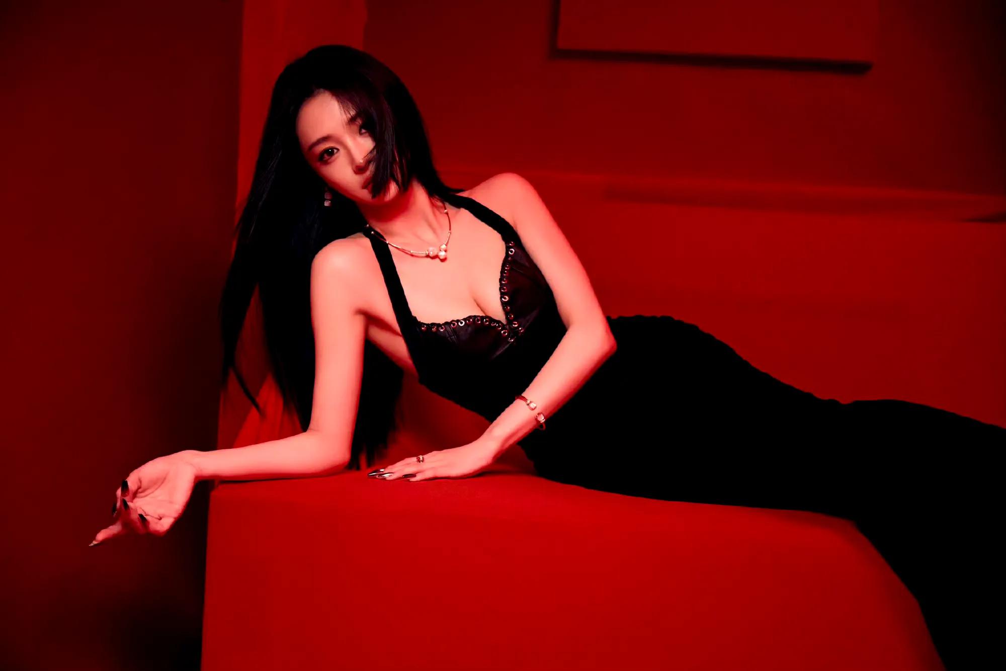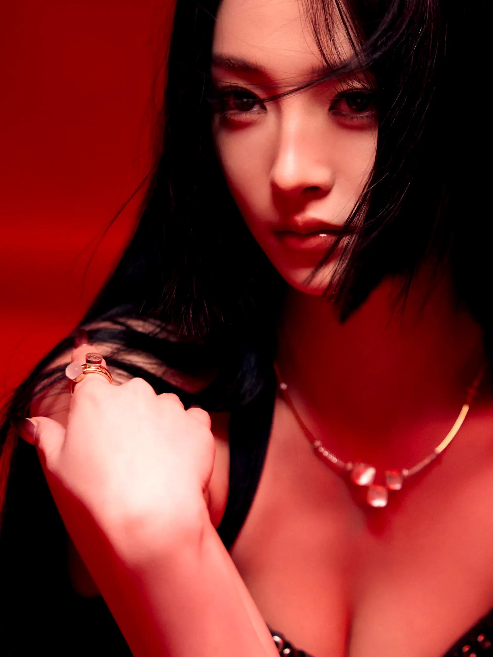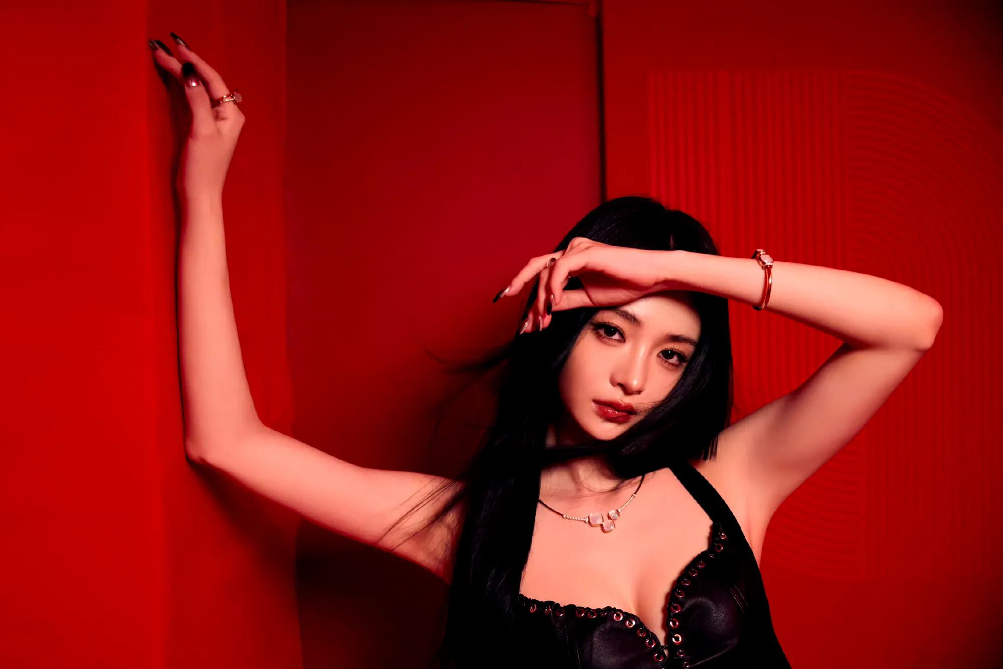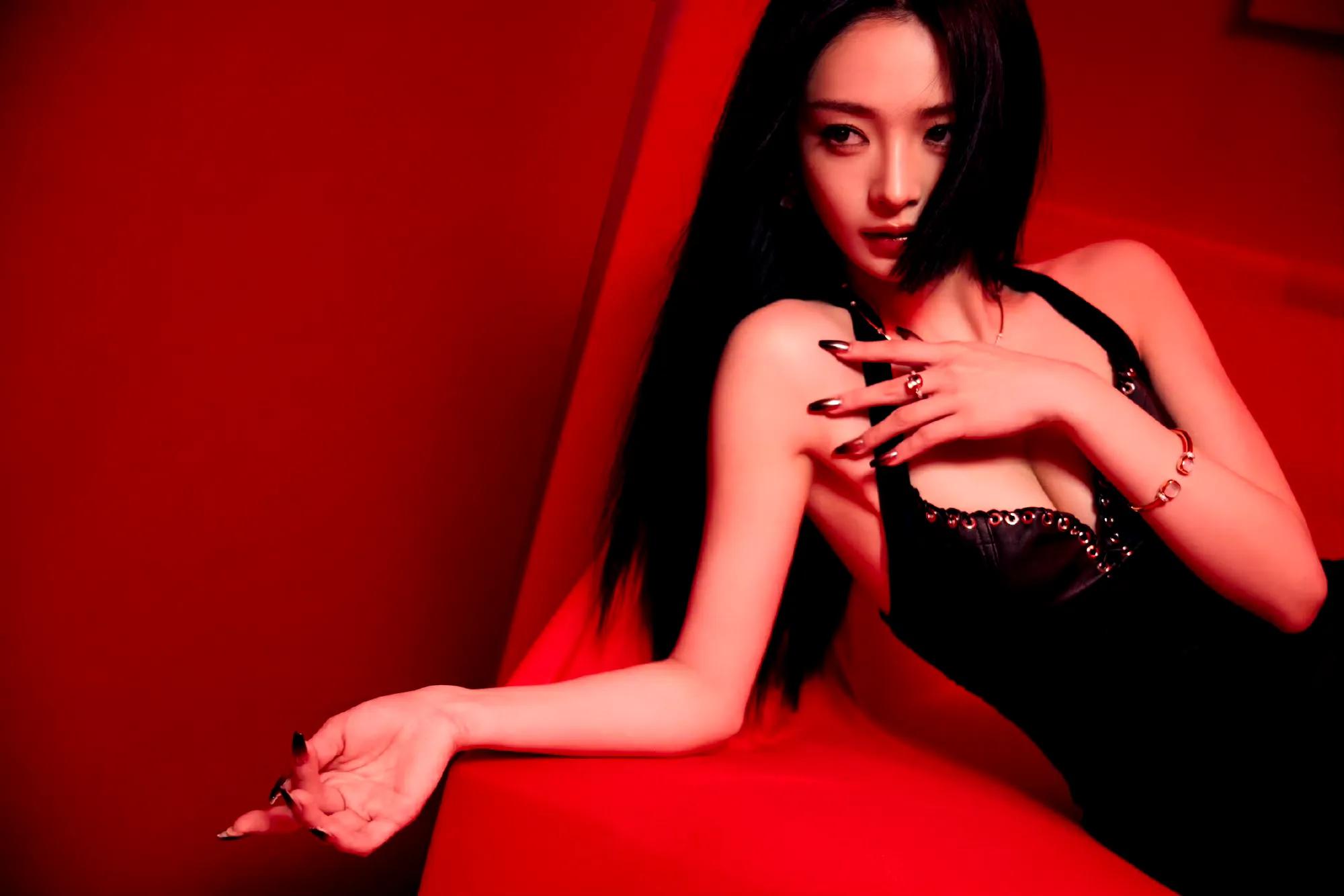 白鹿脚踩纤细高跟,戴黑色皮手套,太欲了