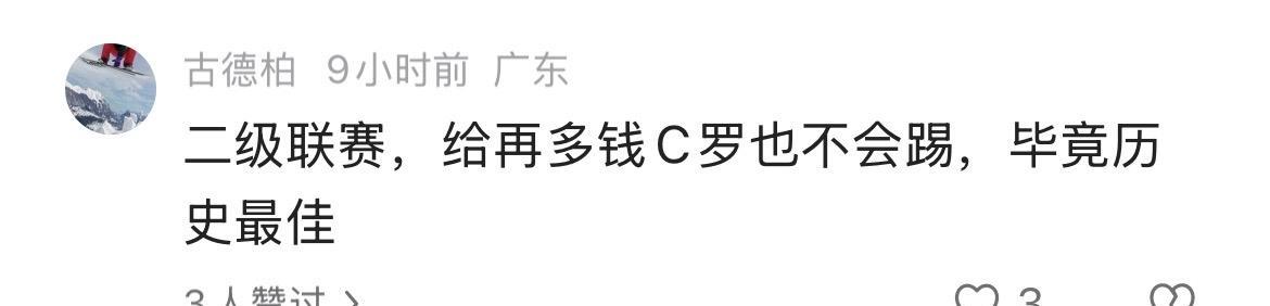 利雅得胜利首场亚冠二级赛,5:0大胜,但是C罗缺席。明明是主场比赛,免去了舟车劳顿,且是虐菜局,C罗为什么不肯参赛,错失刷数据的大好机会?“千球大业”不想要了吗? 罗粉解释道:二级联赛,给再多钱C罗也不会踢。 可为什么C罗在欧洲就愿意参加二级赛欧联杯?这是不是证明了C罗歧视亚洲人?是不是不尊重亚洲人? 罗粉敢不敢回答?