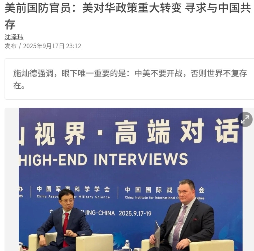 美国对华政策出现巨大转向!9月17日,正在出席北京香山论坛的美国前助理国防部长帮办施灿德表示,美国战争部长赫格塞斯上周有关“不寻求与中国冲突”的说法,标志着美国政策出现重大转变,特朗普政府正寻求与中国共存之道。施灿德强调称,眼下唯一重要的是:中美不要开战,否则世界不复存在。