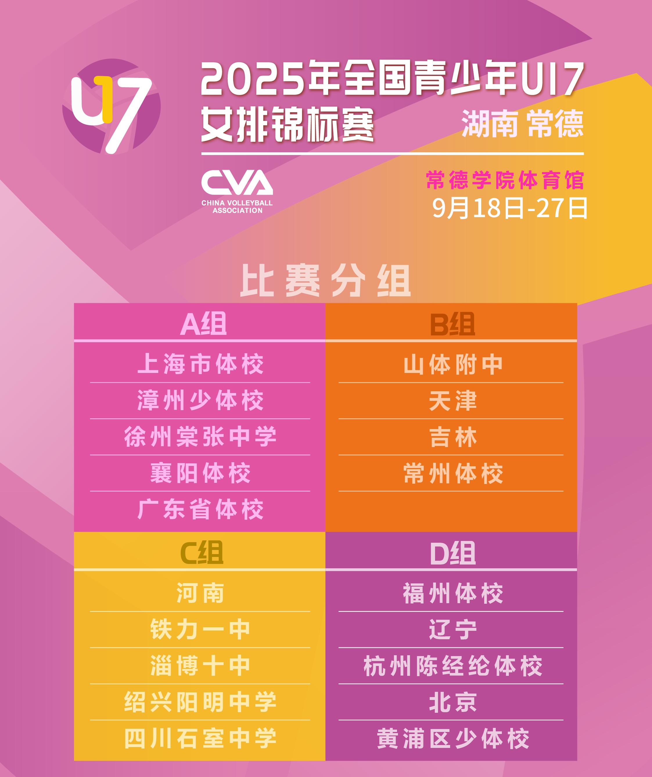 【U17全国女排锦标赛开战】 U17全国女排锦标赛拉开战幕! 比赛时间:9月18-9月27日 比赛地点:常德学院体育馆 观赛渠道:中国排协微博 参赛队伍及分组情况如下: A组:上海市体校、漳州少体校、徐州棠张中学、襄阳体校、广东省体校 B组:山体附中、天津、吉林、常州体校 C组:河南、铁力一中、淄博十中、绍兴阳明中学、四川石室中学 D组:福州体校、辽宁、杭州陈经纶体校、北京、黄浦区少体校