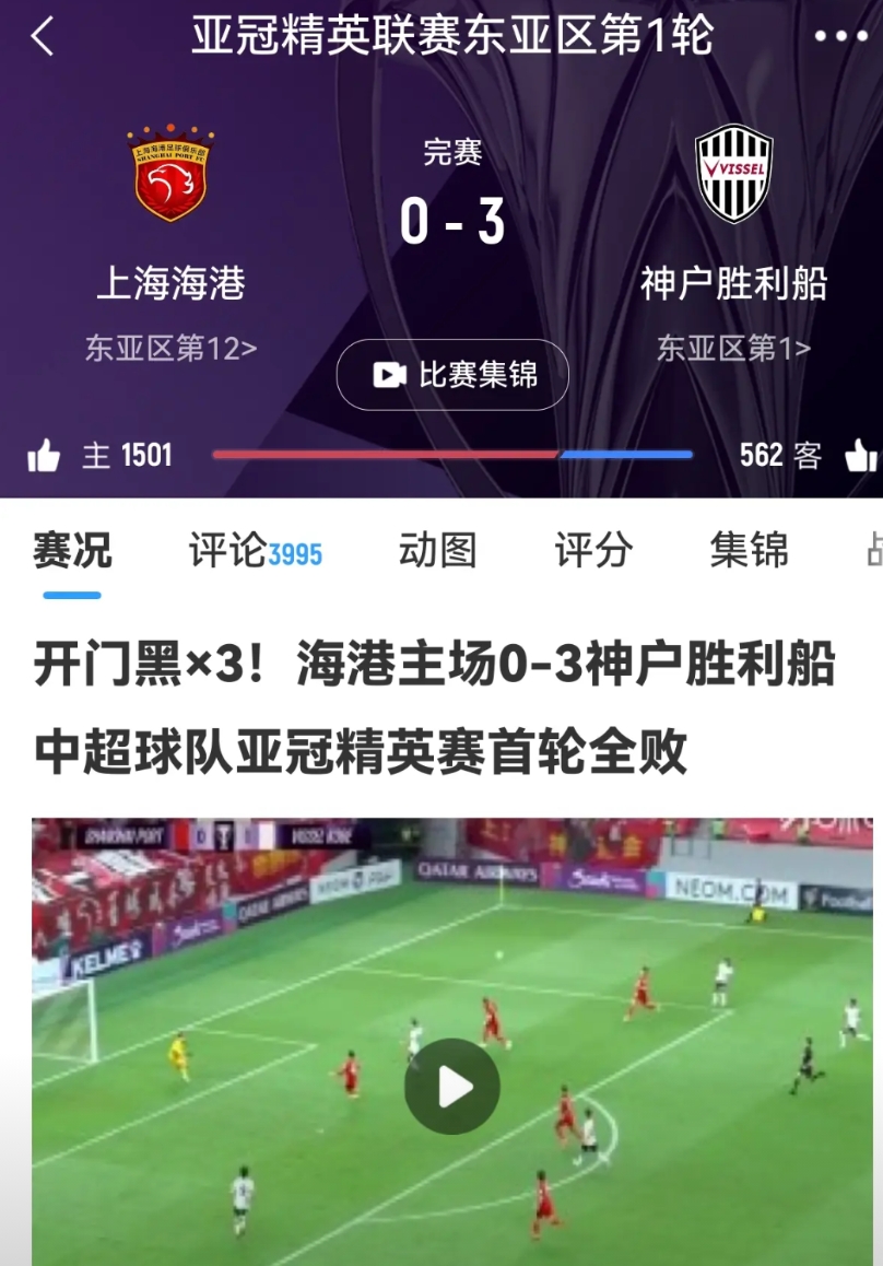 亚冠3连败!中超球队成笑柄! 申花,海港,成都蓉城三支中超前三名球队,亚冠首场全败! 尤其是海港队,居然主场0:3输给日本神户胜利船队! 这就是中国足球的水平,国内俱乐部面对日韩俱乐部,自恒大俱乐部解散后,鲜有胜绩! 输了不知打脸谁!我们足协的贪腐和不作为,耽误了青少年足球发展。与日韩差距越来越大! 校园足球,社区足球开展得也不尽人意!到目前为止,几乎见不到有哪些城市的社区拥有足球场! 缺少校园和社区的基础,我们中国足球想迎头赶上日韩简直是痴人说梦话!一点希望都没有!