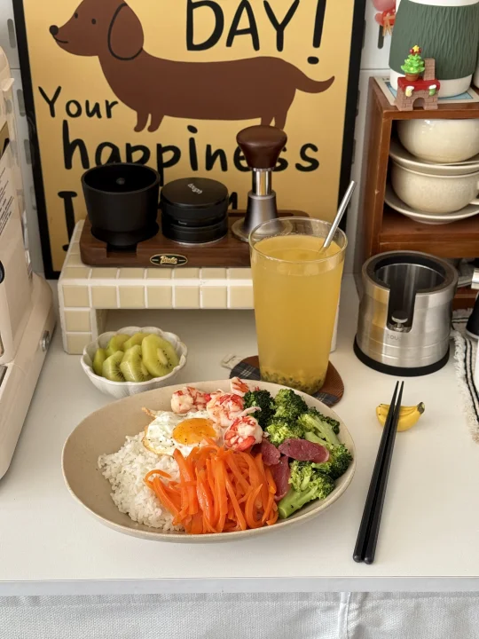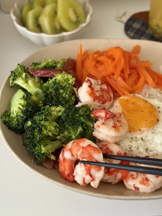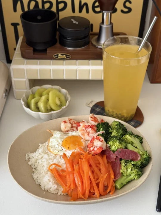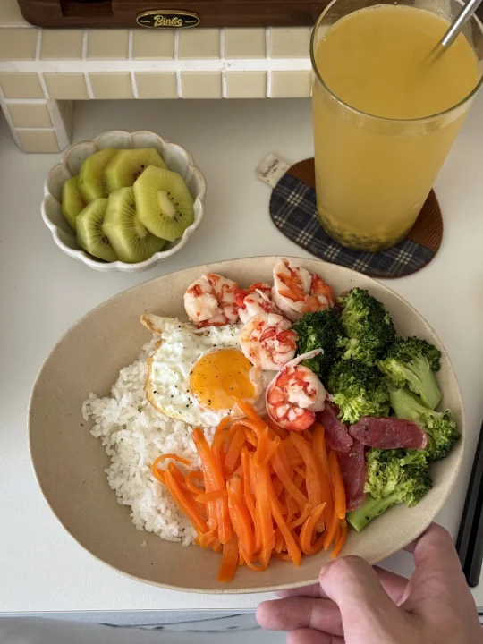 早起真的能做很多事[偷笑R] 锻炼完之后还把午饭做好了[得意R] - 今日午餐🥣 - ▪️白灼黑虎虾🍳 ▪️清炒胡萝卜丝 ▪️腊肠炒西兰花 ▪️百香果茉莉花茶 ▪️🥝 - 好吃爱吃