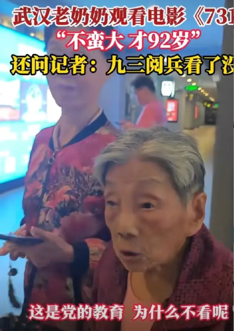 这老奶奶92岁,自称“不蛮大”,被问看不看《731》,她脱口而出“为什么不看,这是dang的教育!”,甚至还问“有没有看93阅兵”,得知对方看了之后喃喃自语道“看了就好”,老人家92岁还关注国家大事,去电影院直面同胞前辈曾经经历的苦难,比那些为了喷而喷的喷子强百倍。