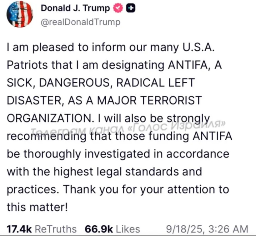 而就在昨天,特朗普将“反法西斯”运动列为恐怖组织,并呼吁对那些资助他所说的“病态、危险、极左灾难”的人进行调查。“反法西斯”是一个意识形态,与“黑命贵”类似,它不是一个物理意义上的组织。要在美国社会清除这种意识形态,应该很难的。